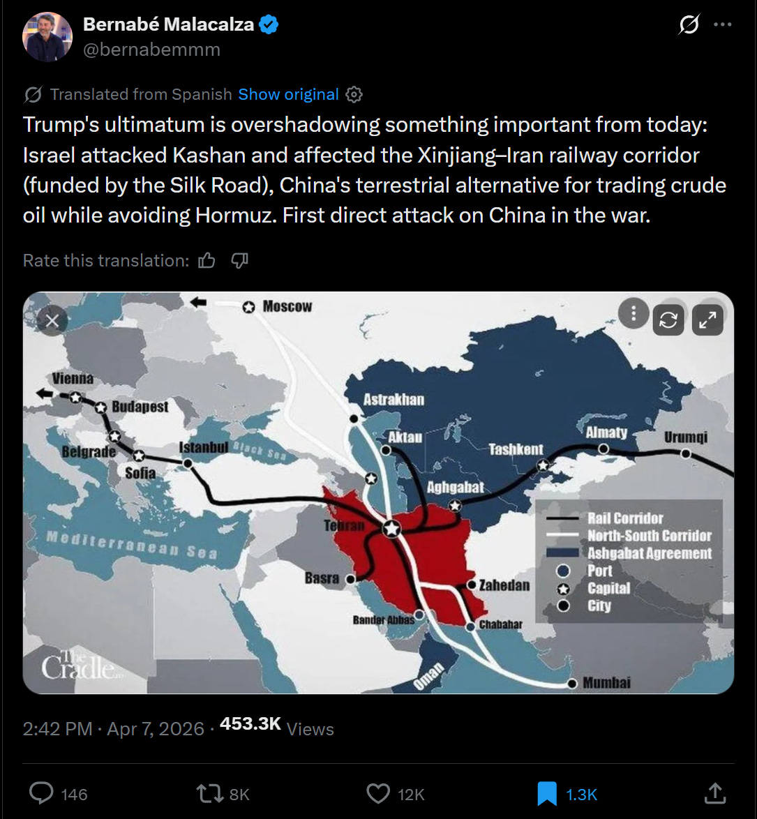 Israel struck the Xinjiang-Iran railway corridor at Kashan, China’s terrestrial alternative for trading crude oil while avoiding Hormuz. First direct attack on Chinese infrastructure in the war.