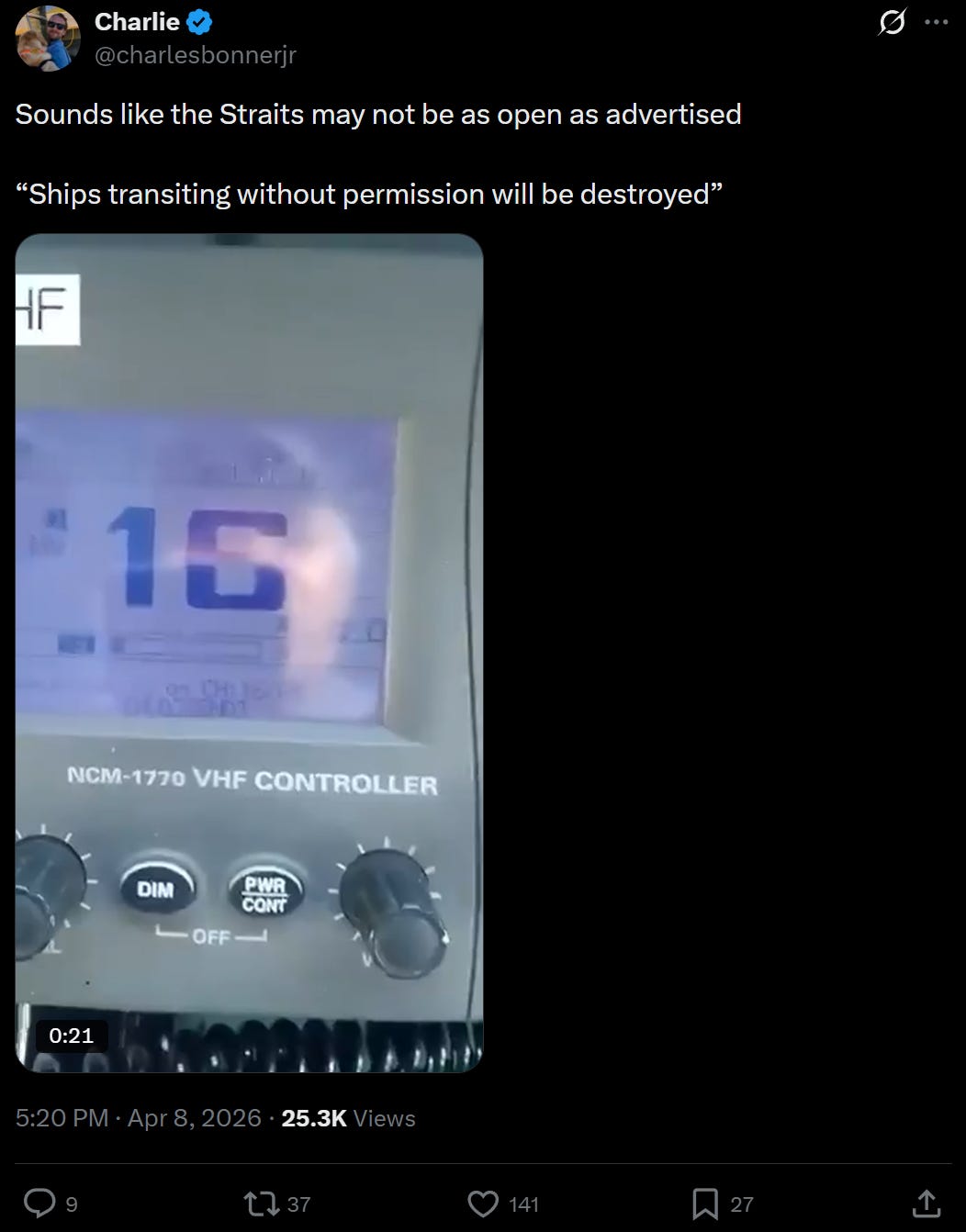 Trump saying “the strait is totally clear” while Iranian VHF controllers broadcast to ships: “vessels transiting without permission will be destroyed.”