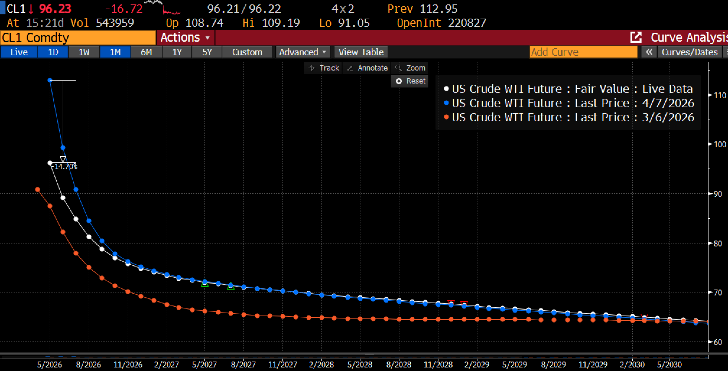 The curve has been in extreme backwardation since Hormuz closed. Front month screaming tight, back months pricing normalization. The ceasefire hit and the front dropped $17. The clock got faster.