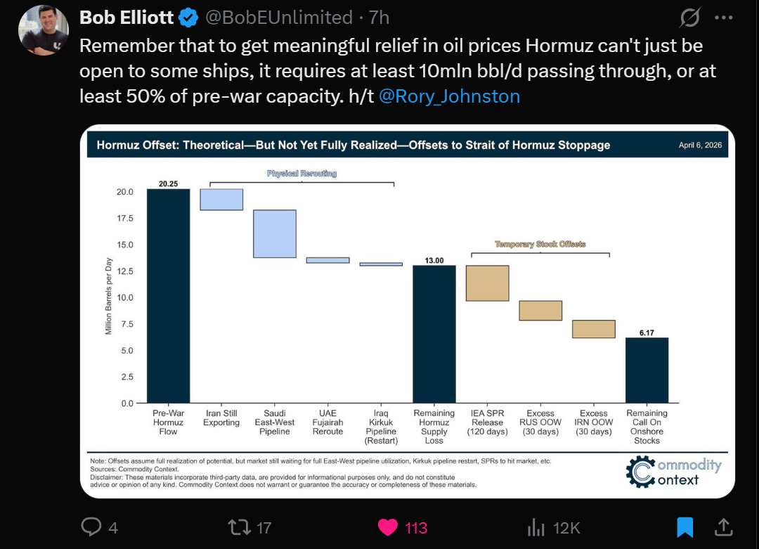 Bob Elliott’s chart puts it plainly: to get meaningful relief in oil prices, Hormuz can’t just be open to some ships. It needs at least 10 million barrels per day passing through, at least 50% of pre-war capacity. Even with every theoretical offset firing, there’s still a 6 million barrel per day gap.
