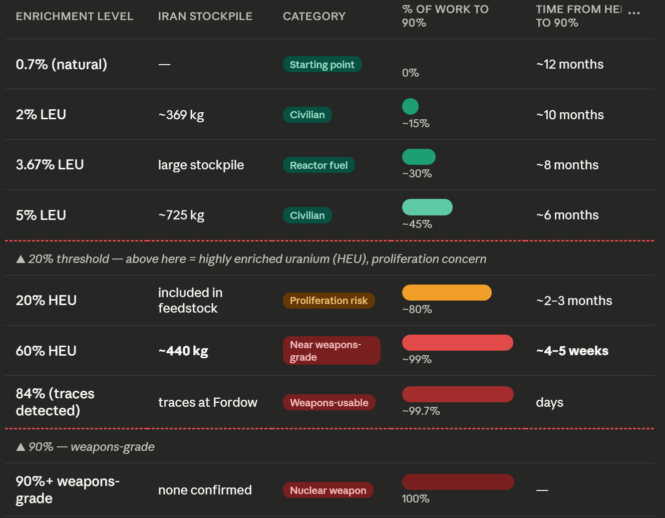 Iran has roughly 440kg enriched to 60%. That’s 99% of the work to weapons-grade and about 4-5 weeks from a bomb. It’s pretty inconceivable that they would not only be allowed to continue enriching but keep their stockpile of 60% highly enriched uranium (HEU). 20% HEU is defensible for civilian nuclear uses, the only reason you go past there is to get nukes, and by the time you are at 60%, you are 99% of the way there.