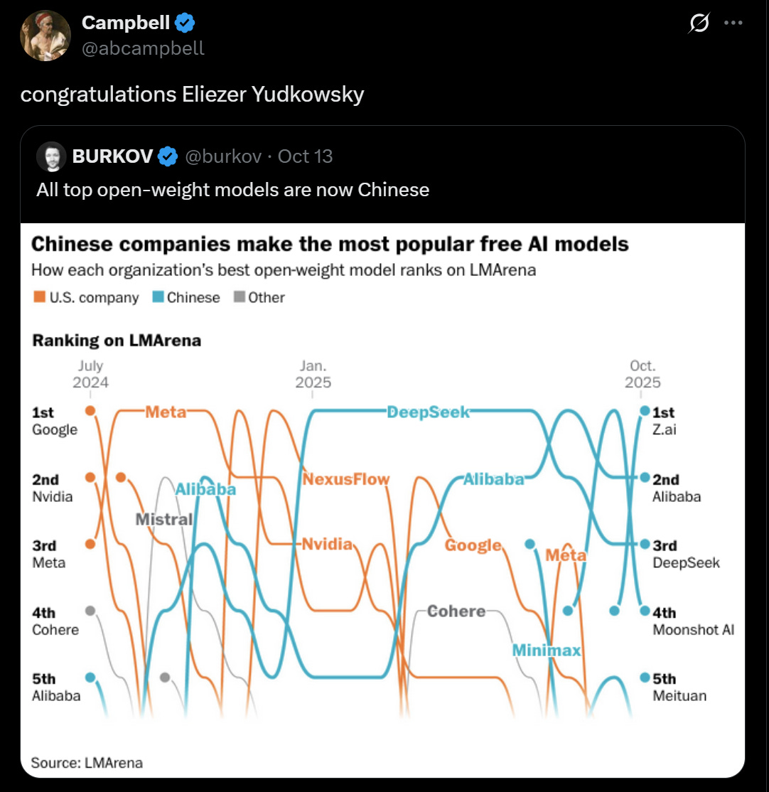 DeepSeek, Qwen (Alibaba), GLM (Zhipu) et al —all open source, all competitive with GPT-4, all free. US startups build on them because it’s cheaper and faster.