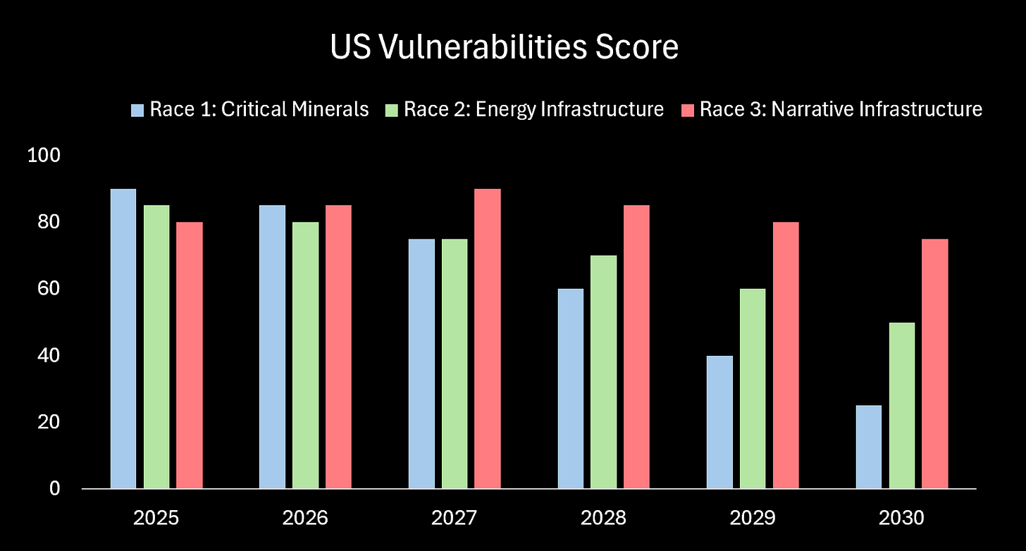 That’s our risk. Not that China wins. That they exploit our vulnerabilities before their window closes.