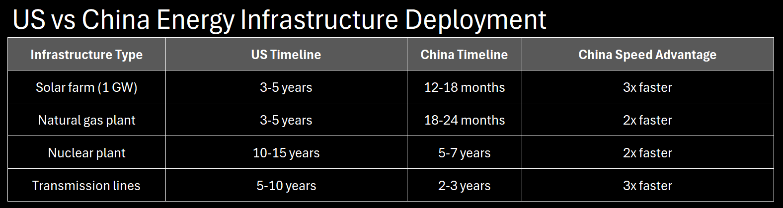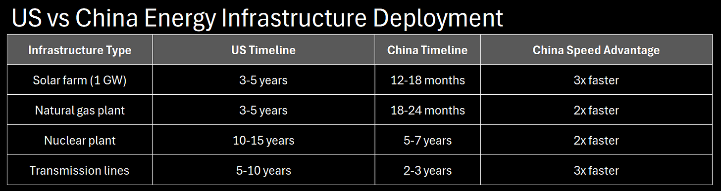 Current status: building too slow for AI demand explosion (4.4% of electricity today → 8-12% by 2030). Our buildout timeline: 5-10 years. China building 2-3x faster on every metric. Not existential short-term, but determines long-term AI dominance. Whoever builds energy infrastructure first deploys AI at scale first. MEDIUM RISK—survivable short-term, decisive long-term.