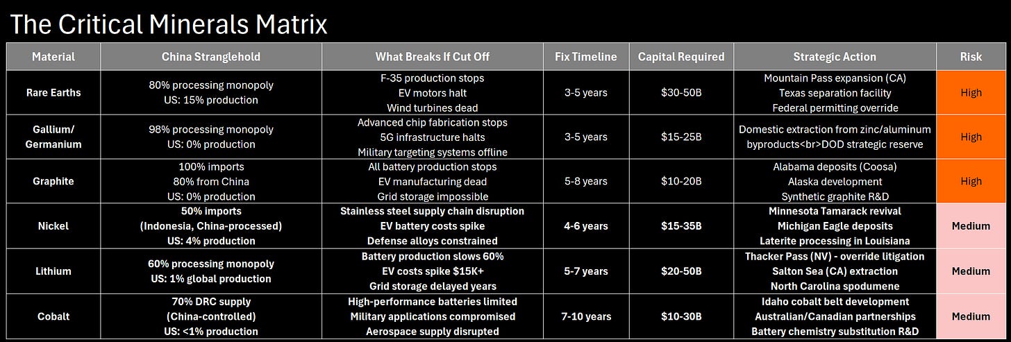 The dependency isn’t mining—it’s processing. Mountain Pass mine in California produces rare earths. But we ship the ore to China for separation because we shut down processing in the 1990s.