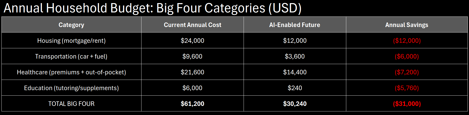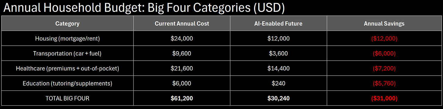 Consumer goods represent 5-8% of average household budget. The Big Four consume 60-70%. Even if consumer goods prices rise 20%, you save 50% on Big Four expenditures—net $30,000 ahead annually.