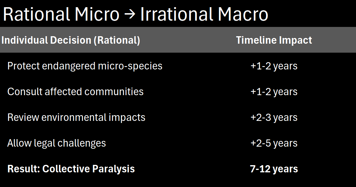 Here’s what happened to America: We built a system where every micro-decision is individually rational, but they aggregate into macro-paralysis.