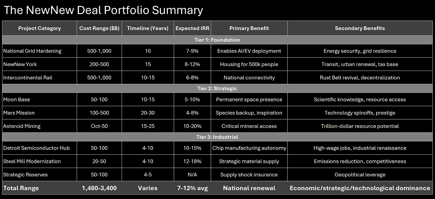 This is what I call the New New Deal—a comprehensive vision for American renewal that makes the short-term pain worthwhile. What follows are examples from that larger framework, which I’ll detail in a later post. But you need to see the destination to understand why the journey matters.