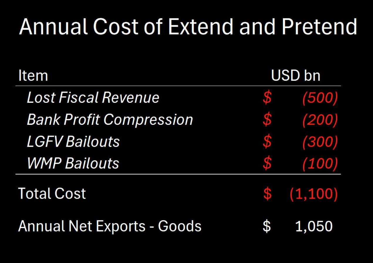 $500B in lost land sale revenue (local governments’ main funding source, down 50% from peak). $200B in bank profit compression (lending at low rates to zombies while paying depositors). $300B in direct LGFV bailouts and rollovers. $100B in WMP rescues and “restructuring.”