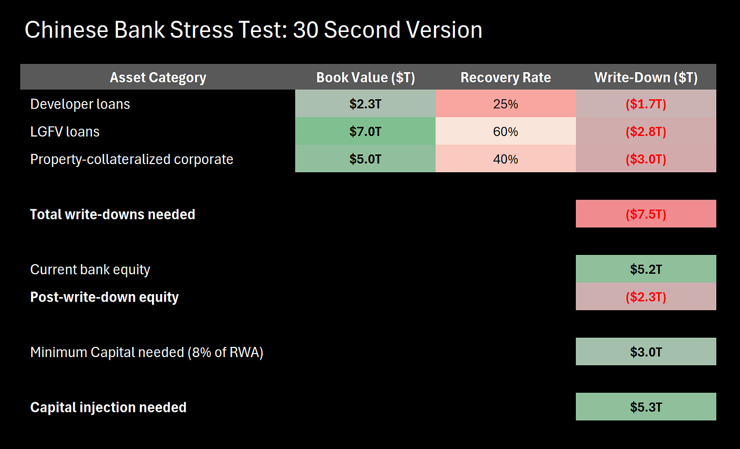 The household losses—the $2.2 trillion for unfinished apartments—don’t directly hit bank balance sheets. But they make everything worse. Crushed households can’t consume, can’t buy new homes, can’t generate the growth needed to grow out of the debt. It’s deflationary dead weight.