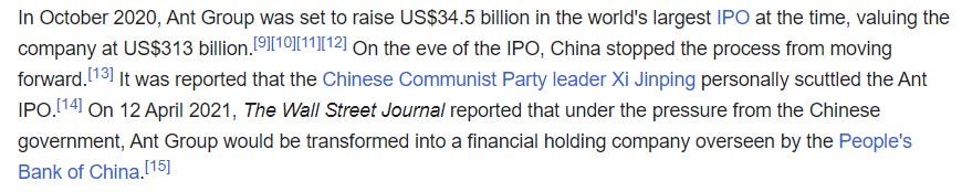 Before the IPO was scuttled, Ant Financial (the parent holding company behind AliPay) was valued at $300bn IPO. For those counting at home that’s about as valuable as ICBC and Bank of China, combined.