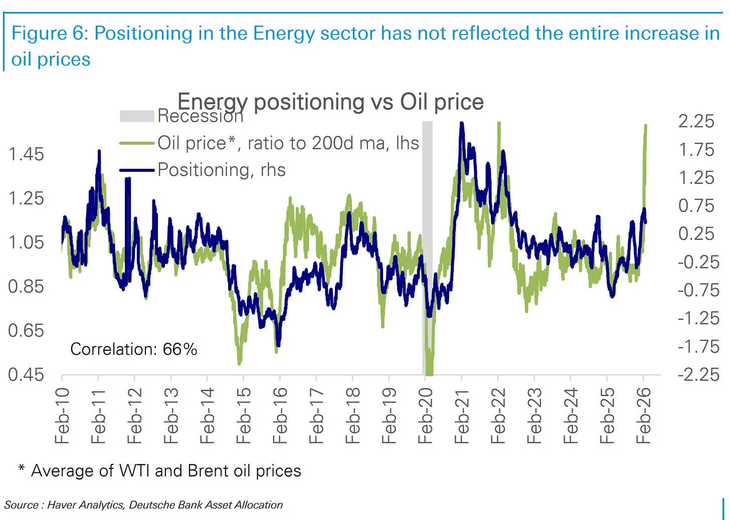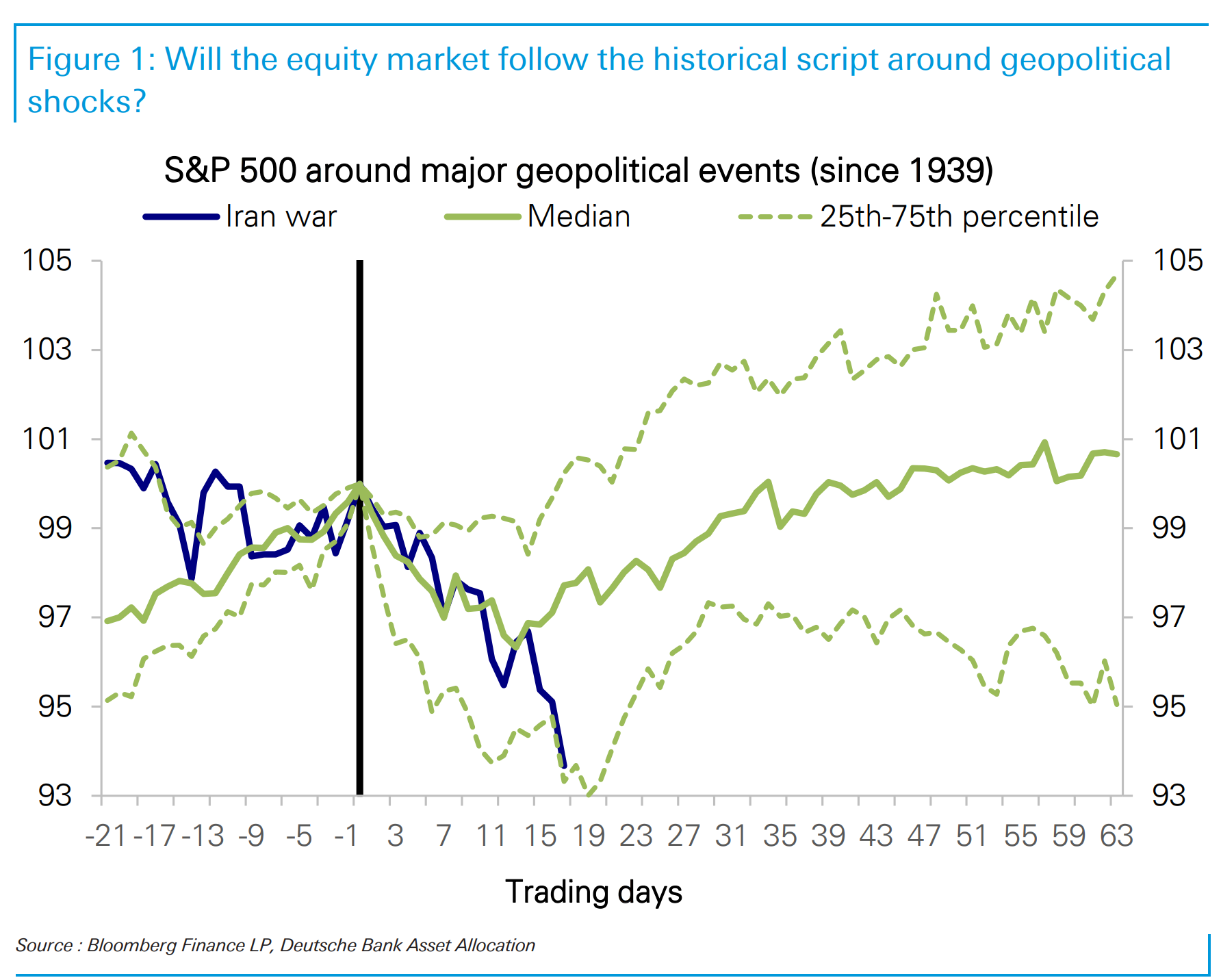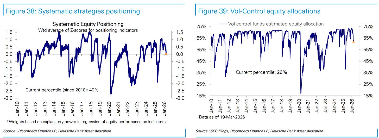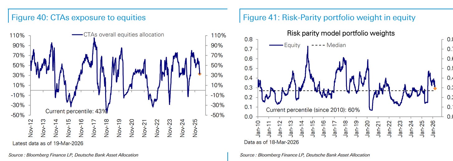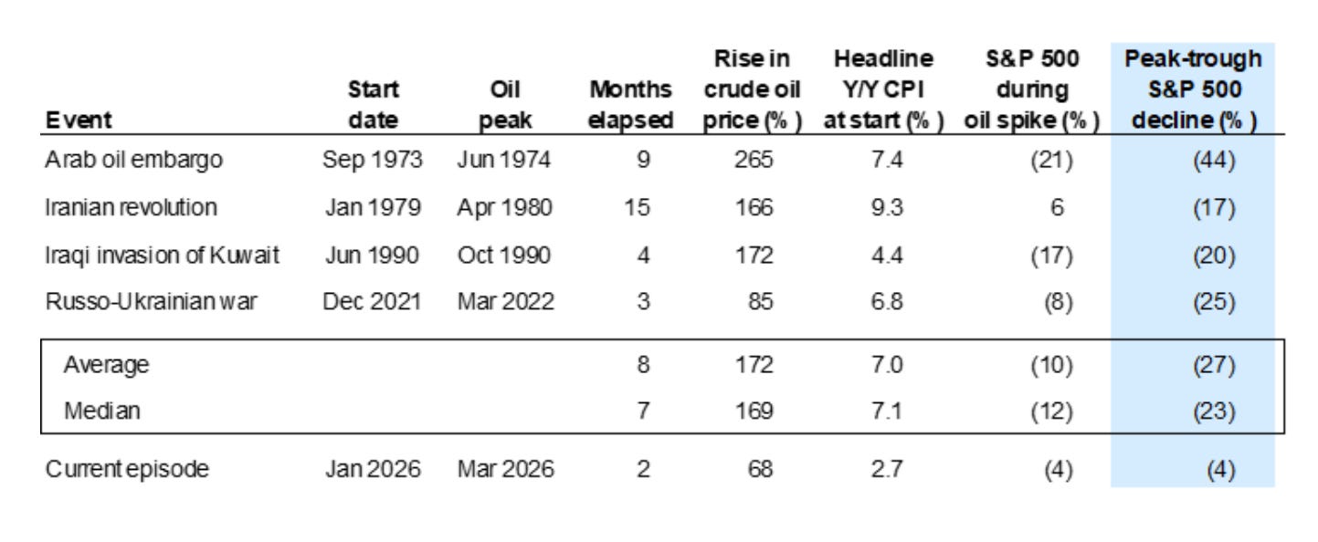 The market, as of this morning, has priced in roughly a 4% drawdown in equities since this started. The historical median for major oil shocks is 23%. Real money is still long the wrong stuff. Vol-control funds are still near full equity allocation and will be forced sellers when realized volatility picks up, which it will.