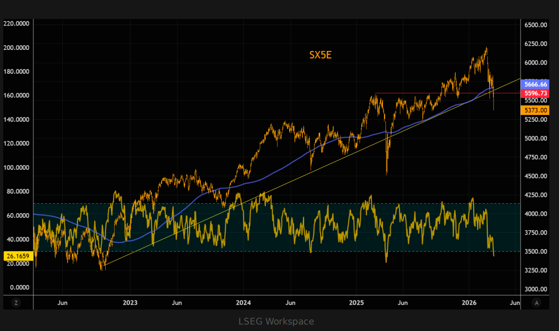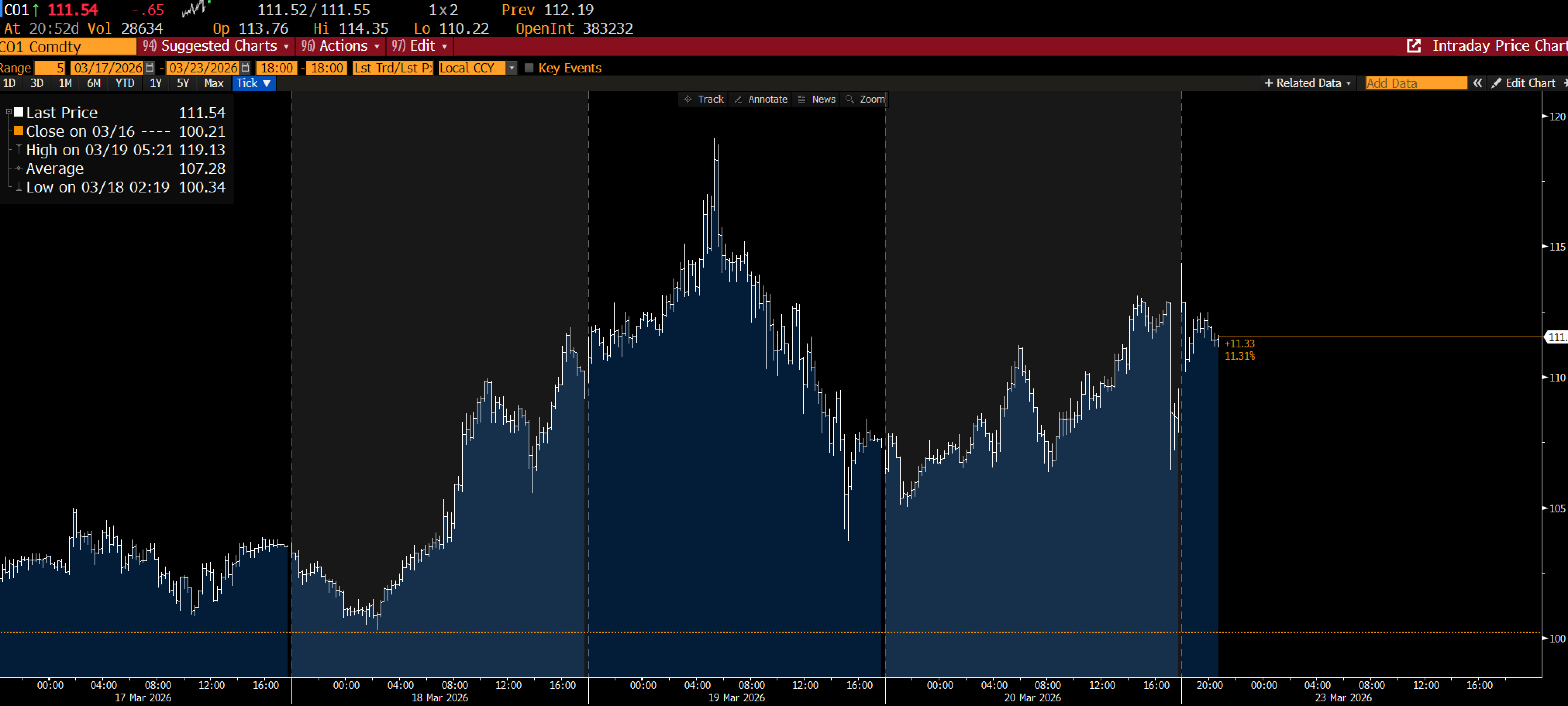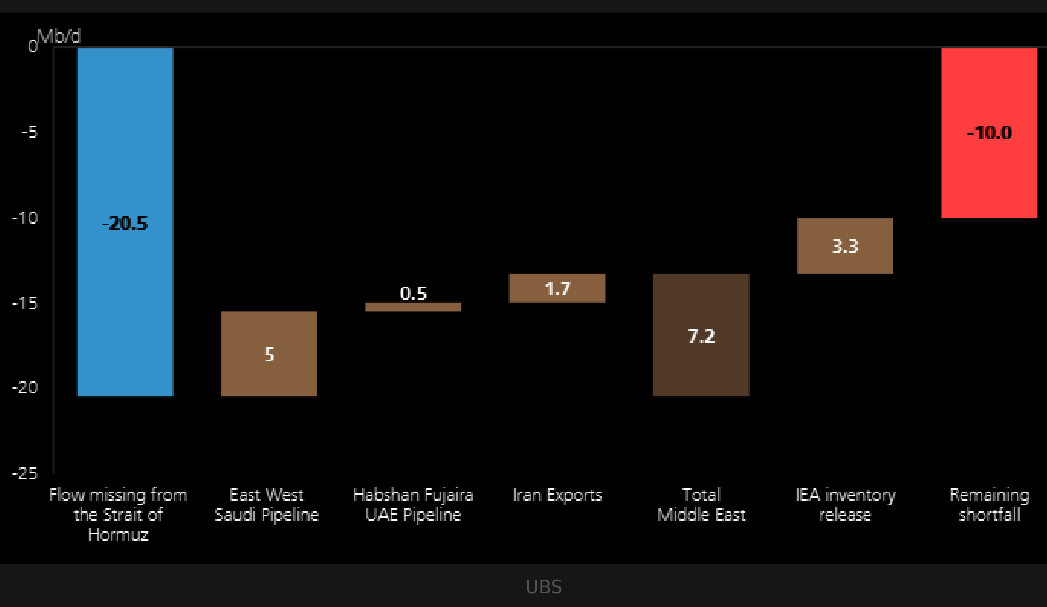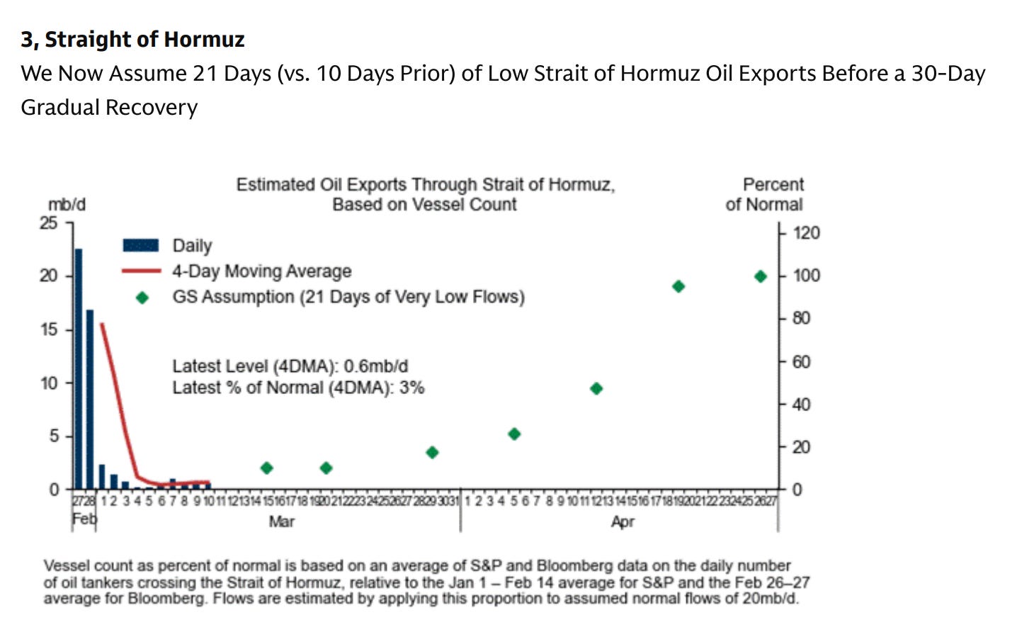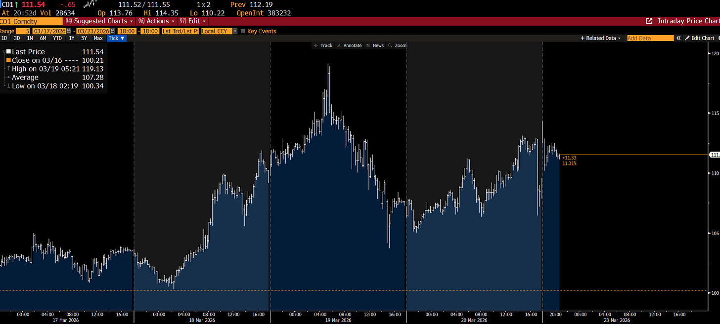 The market, as of this morning, has priced in roughly a 4% drawdown in equities since this started. The historical median for major oil shocks is 23%. Real money is still long the wrong stuff. Vol-control funds are still near full equity allocation and will be forced sellers when realized volatility picks up, which it will.