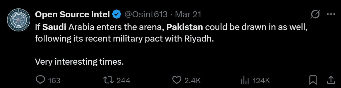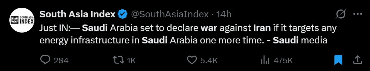 Saudi putting down a red line. One more strike on energy infrastructure and they go to war. Worth recalling that Saudi also has a defense pact with Pakistan. Which would be quite the turn.