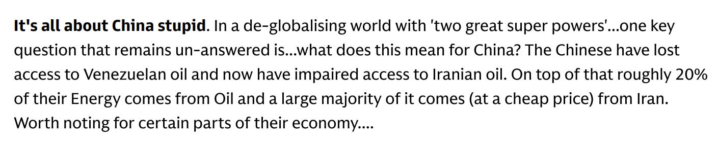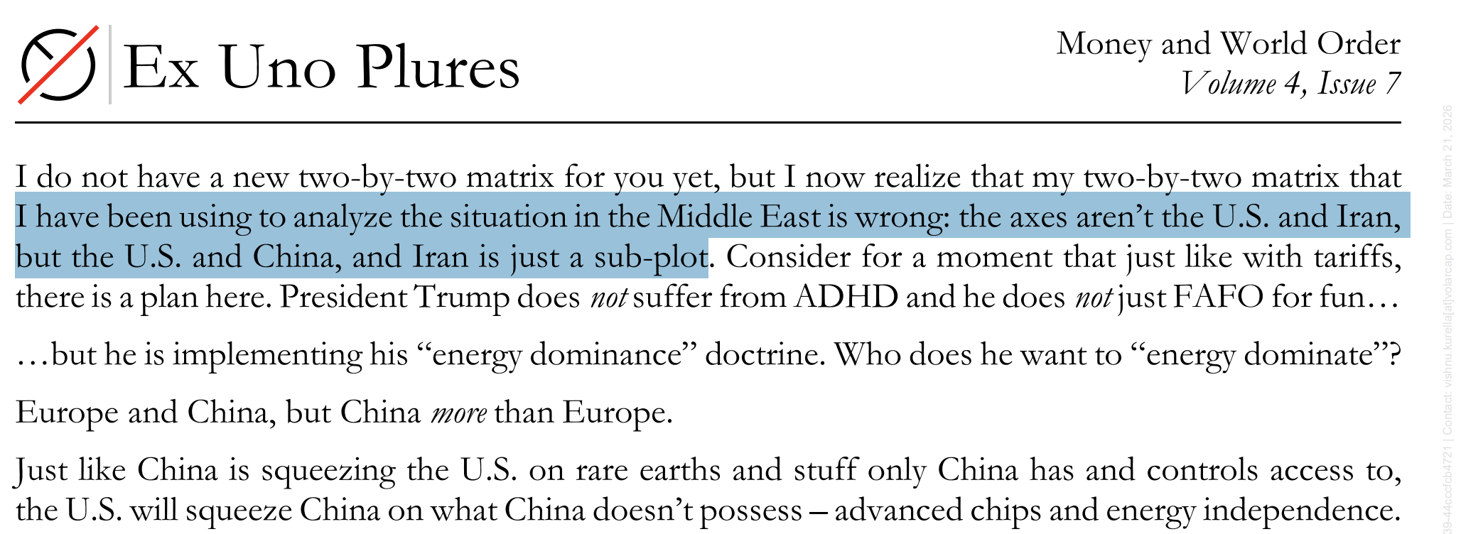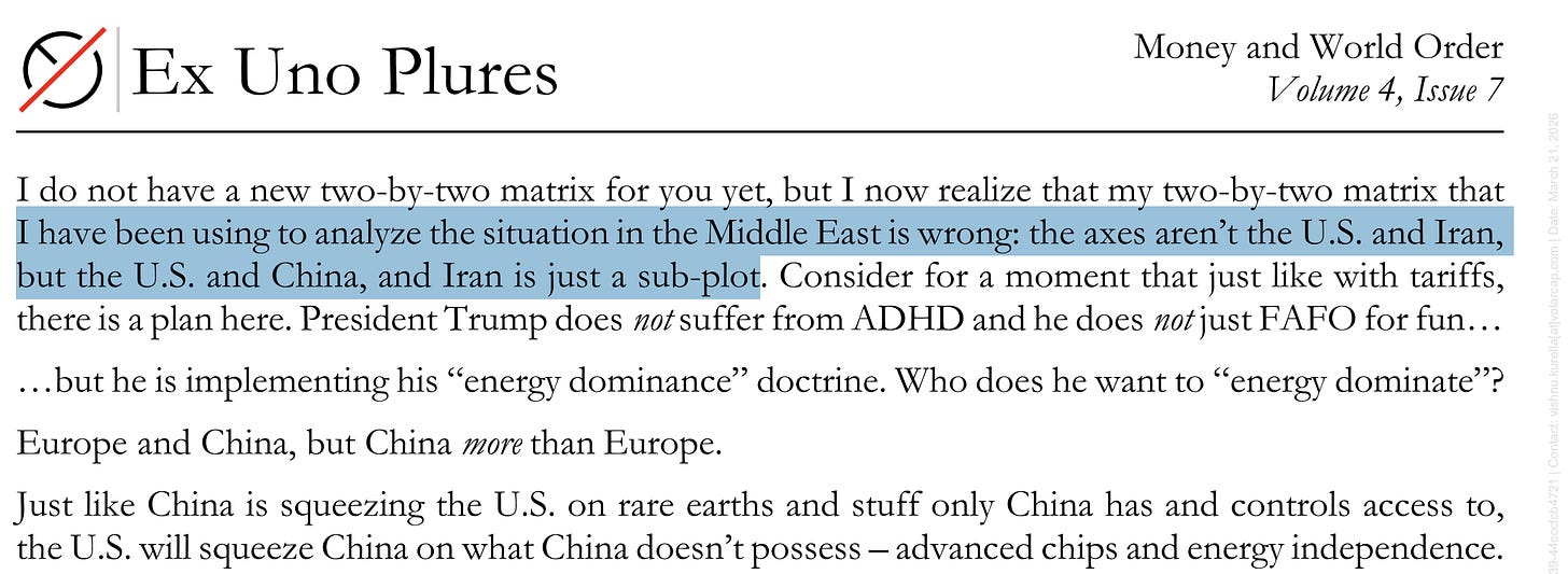 My book is positioned for what comes after everyone finishes pretending this resolves quickly. Short credit because the spread compression that made sense in a stable globalized world doesn’t make sense in this one. Long energy because if you are short oil here you are betting on peace, and I’m not ready to do that. Long gold because when a country weeks from nuclear capability, with ballistic missiles already in the air, tells the world to dump your reserve currency, that's not a headline you fade.