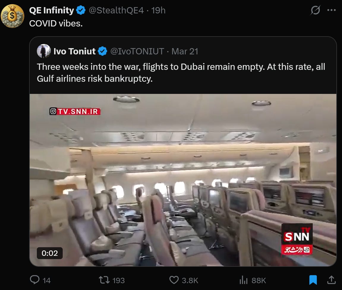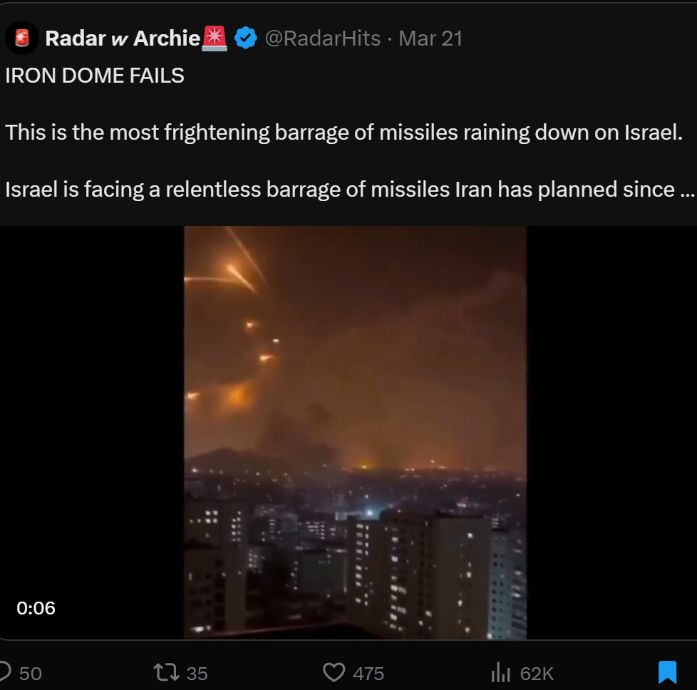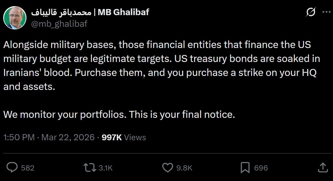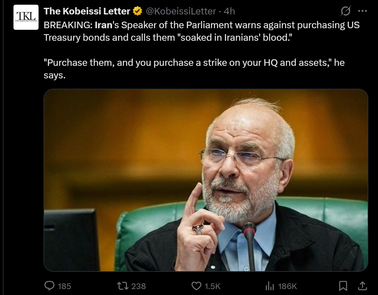 Iran’s parliament speaker told the world that US Treasuries are soaked in Iranian blood and that buying them means buying a strike on your own assets. This morning there were rockets raining down on Tel Aviv. Iron Dome is struggling with the volume.