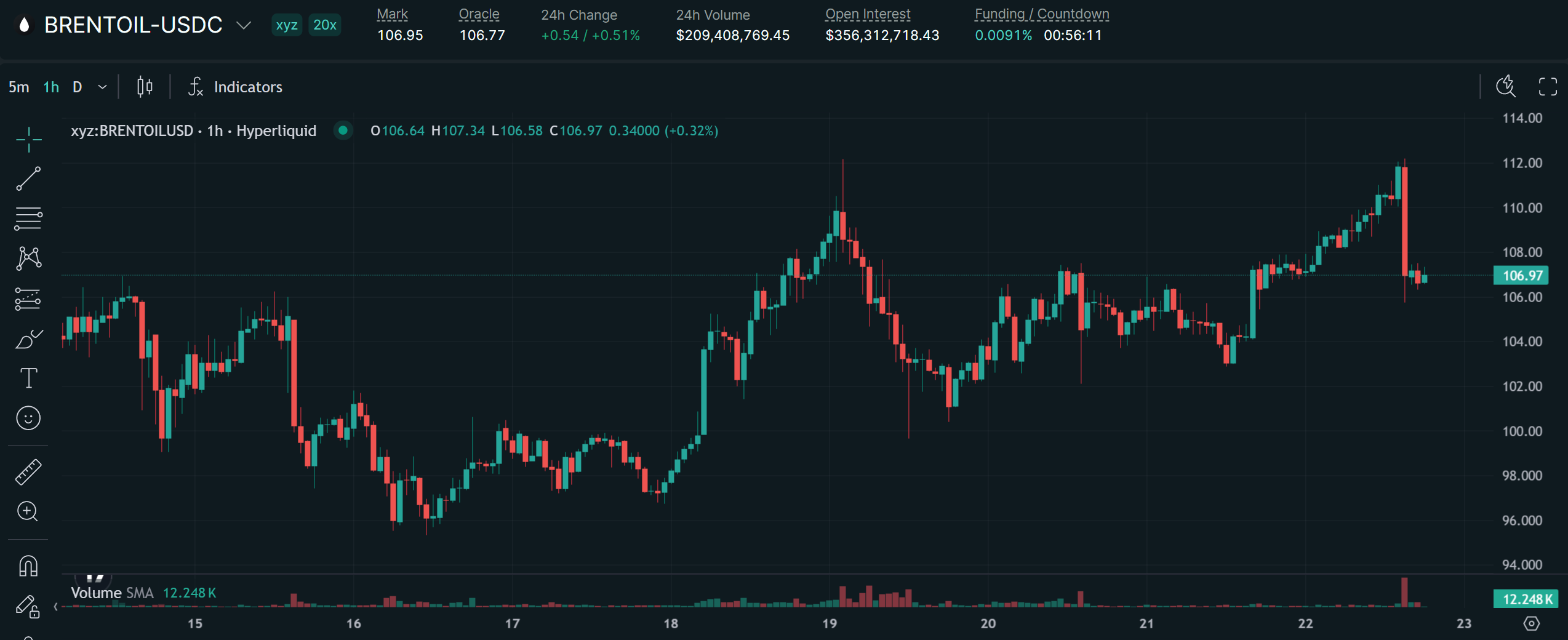 As things deteriorated over the weekend, Brent on Hyperliquid rallied 5% before futures opened and brought it back in line.