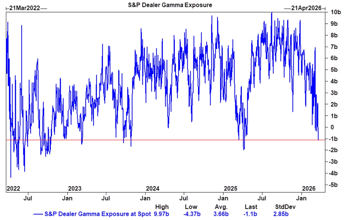 As mentioned above, for the past two weeks, the market has felt ‘long vol.’ Meaning dealers (who delta-hedge) had a positive exposure to realized volatility, but act in ways that ironically dampen that volatility, buying when the market sells off and selling when the market rallies. That’s over, and they are moving into short vol territory.