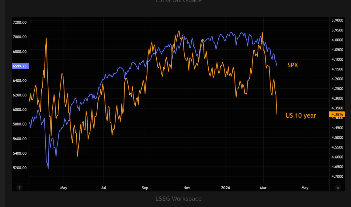 Market is beginning to remember the linkages, there are bonds in the stocks, inflation is about oil, if oil rallies, bonds sell off (at least until the damage to stocks is so bad that bonds start to rally but we’re still a leg down before that happens).