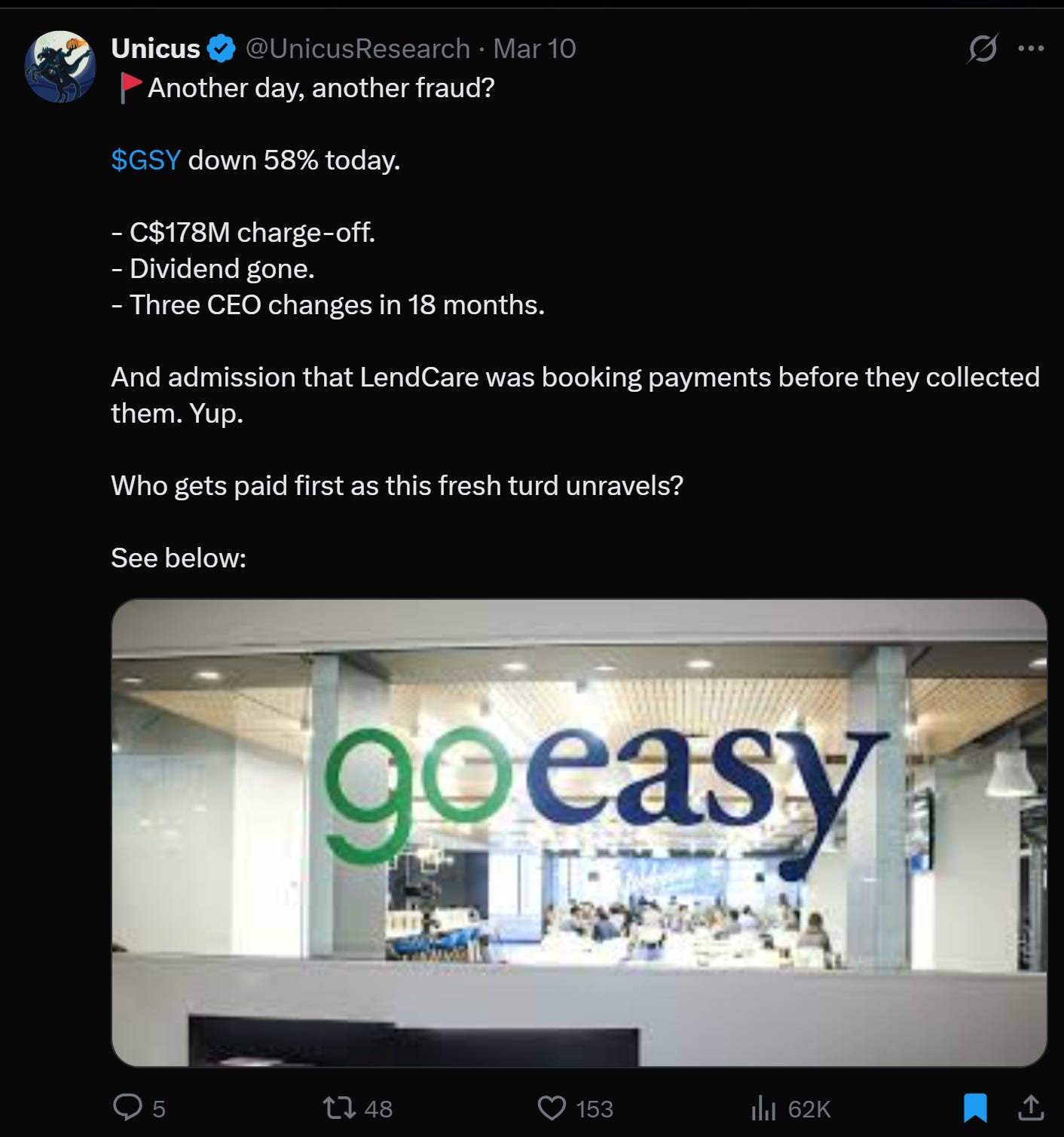 The Fraud is Showing Up. GoEasy ($GSY) dropped 58% in a day on a C$178M charge-off, dividend elimination, three CEO changes in 18 months, and admission that its LendCare division was booking payments before collecting them. This is what the tail of a credit cycle looks like.