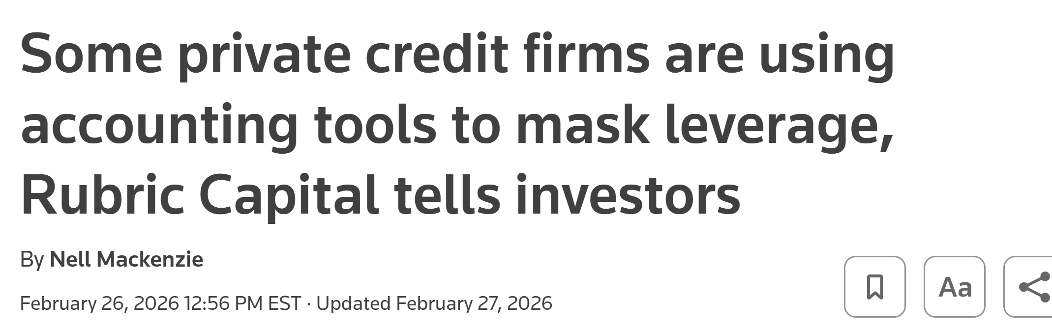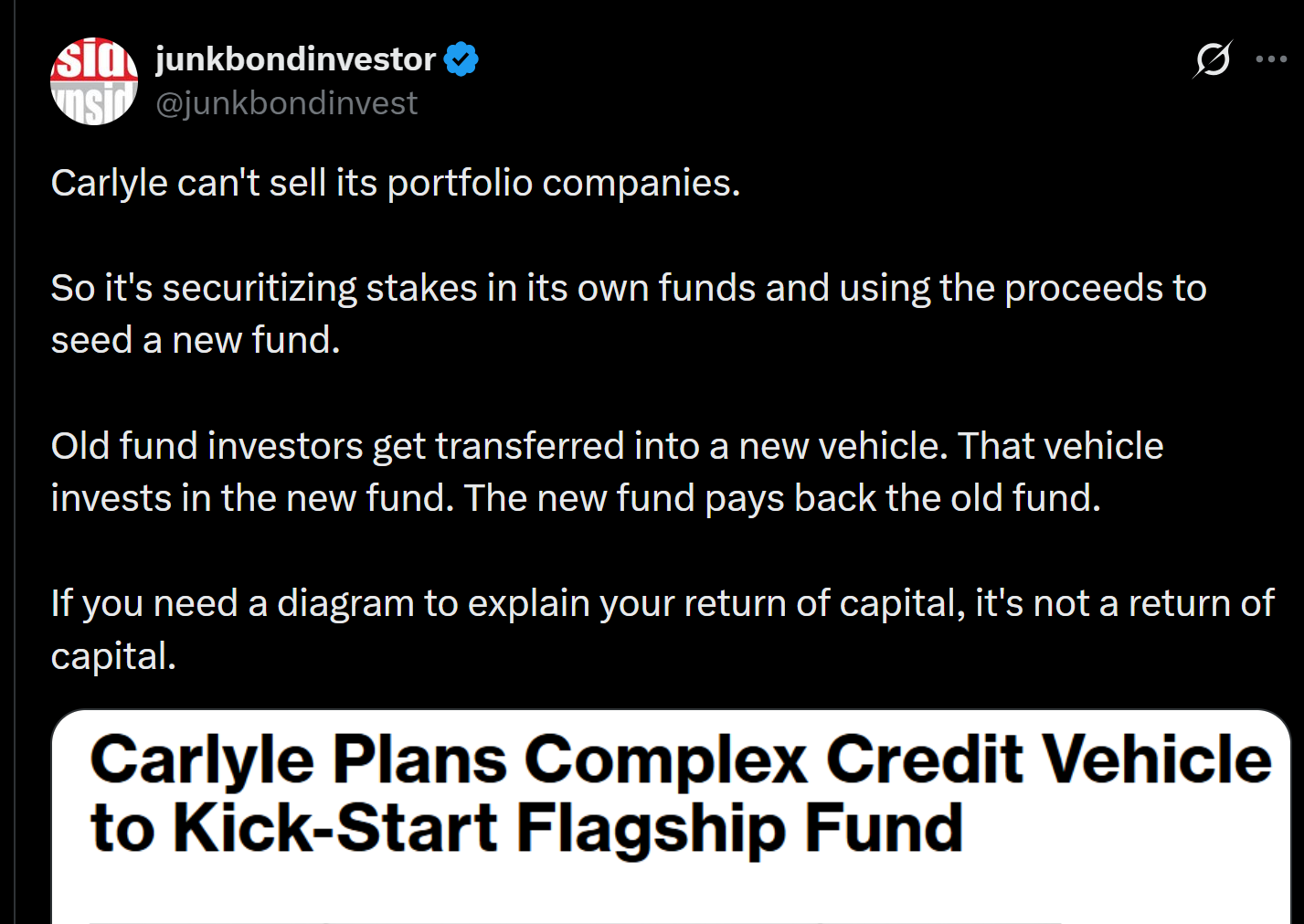 Creative Accounting is Emerging. Carlyle reportedly can’t sell its portfolio companies, so it’s securitizing stakes in its own funds and using the proceeds to seed new vehicles. Rubric Capital is telling investors that some private credit firms are using accounting tools to mask leverage. When the financial engineering starts getting baroque, you’re late in the cycle.