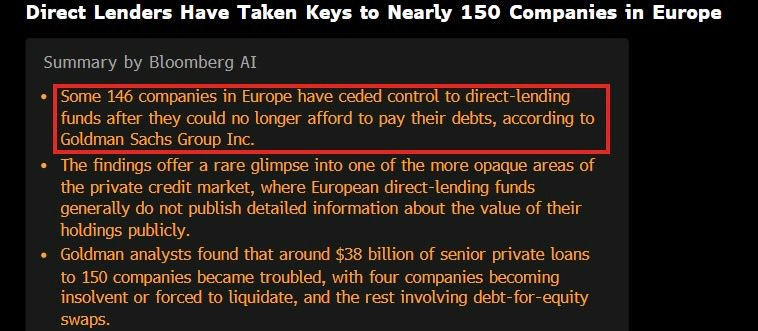 Europe Is Cracking Too. Goldman Sachs found that around 146 companies in Europe have effectively handed control to their direct-lending funds after they could no longer service their debts. About $38 billion in senior private loans to 150 European companies became troubled, with four going insolvent and the rest restructuring through debt-for-equity swaps. And European insurers and pension funds, which have been among the biggest allocators to private credit, are starting to flag concerns.