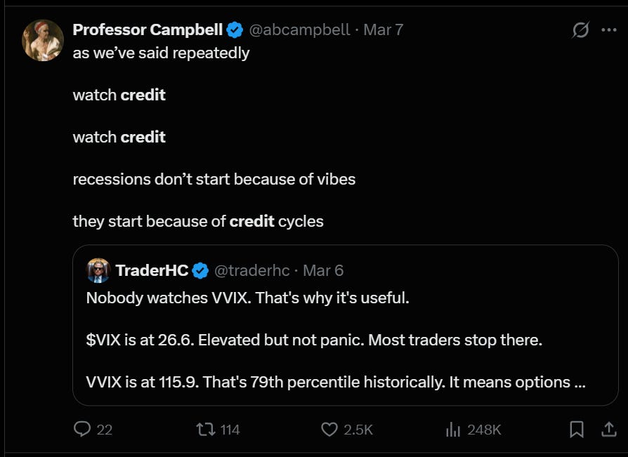 I am not saying credit is a perfect short right now. Timing these things is brutally hard, and I’ve been early before (the silver trade subscribers will recognize the pattern). What I am saying is that if you want to understand the scenario that leads to recession, if you want to understand the transmission mechanism for a real down-market, you need to be watching credit.