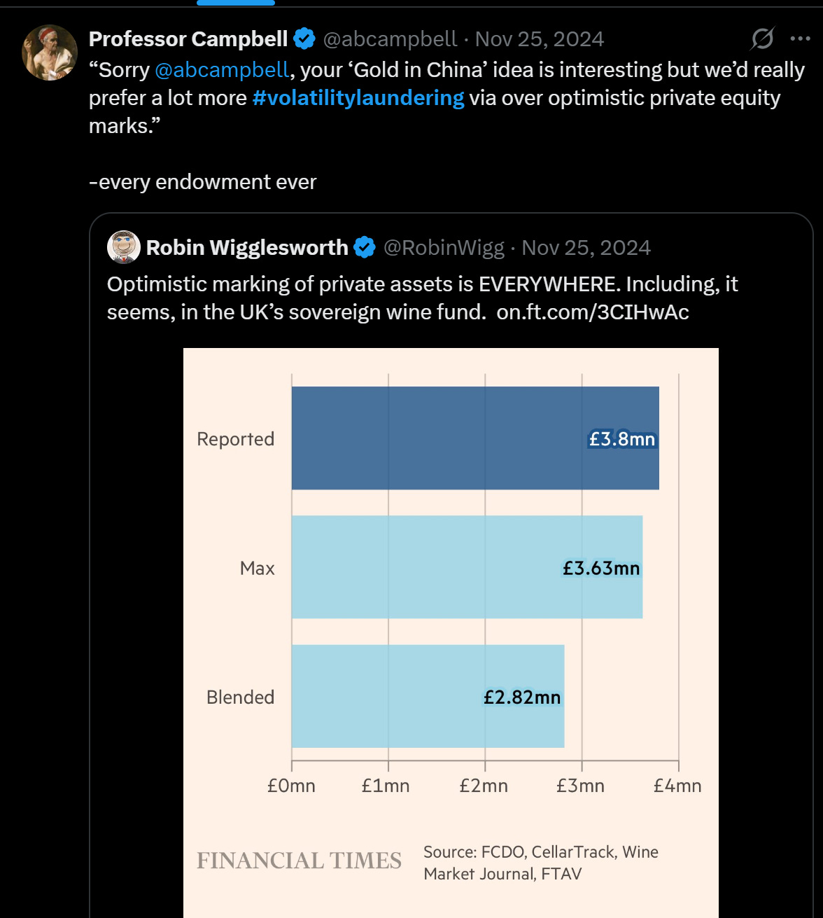 There are features to this approach. Old markets heads will remember the debate over Level 2 vs Level 3 assets back in 2008. Sometimes you don’t want to report day-to-day volatility because it can become reflexive: investors react to down marks by selling, which pushes marks lower, which triggers more selling. Smoothing the ride has real benefits for long-term capital.