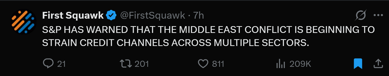 And the Middle East isn’t helping. S&P has warned that the conflict is beginning to strain credit channels across multiple sectors.