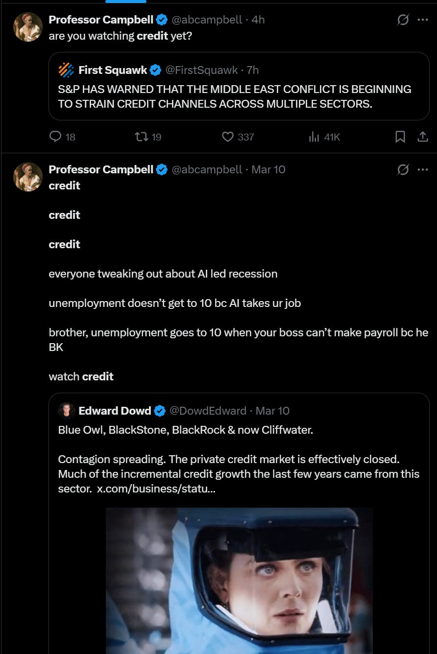 Conflict is inflationary. Oil disruptions, the latest tanker on fire in Hormuz, put a floor under energy prices and keep inflation expectations elevated. Which means the Fed can’t ease aggressively even if credit conditions deteriorate and labor markets soften. If credit brings us lower while the Fed is pinned by conflict-driven inflation, they’ll be behind the curve in a way that rhymes with the worst policy errors of the last fifty years.