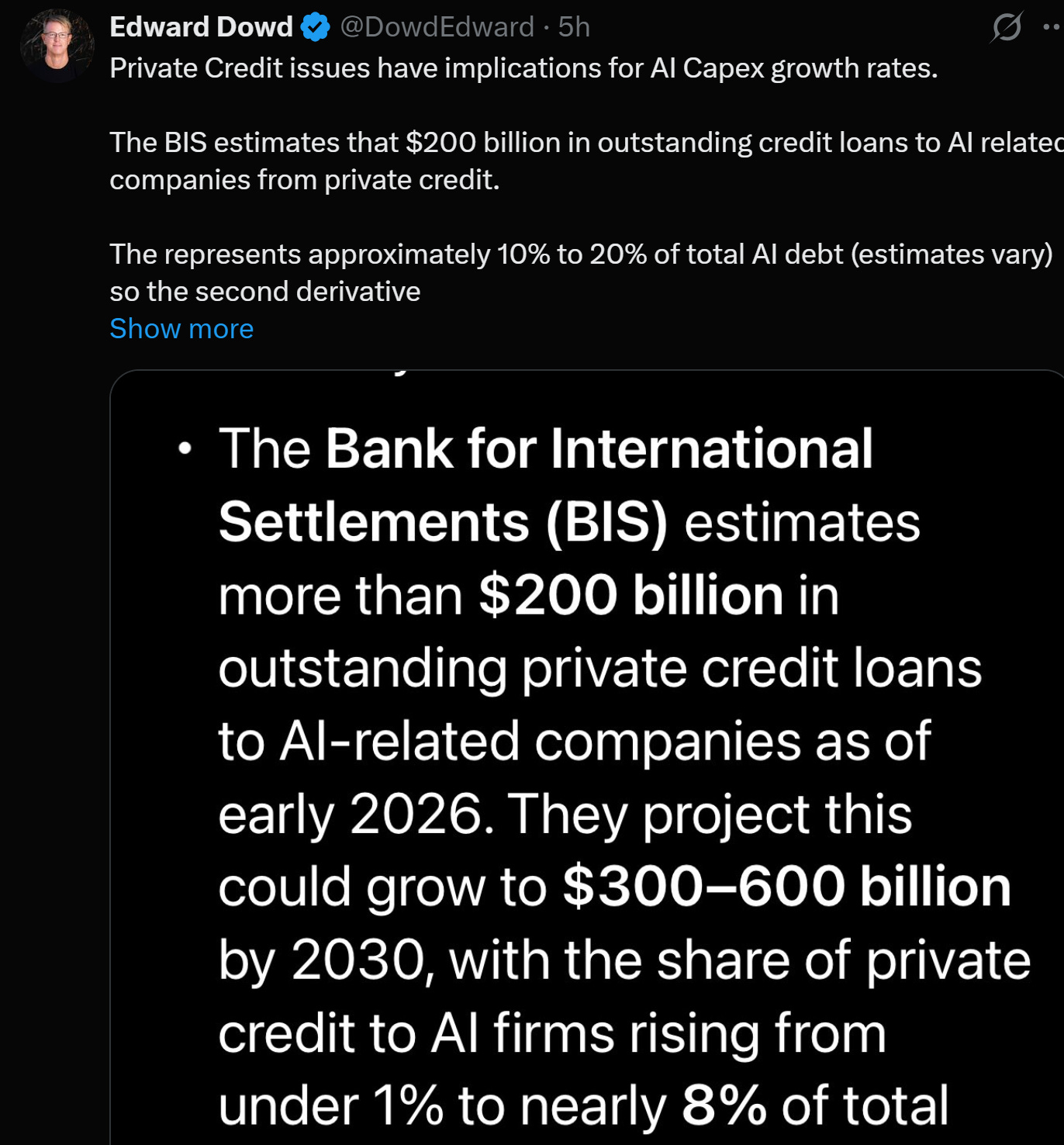 And here’s the kicker that ties the whole thing together: the current growth engine of the US economy is AI infrastructure. Data centers. Massive capital expenditure programs from the hyperscalers and their downstream suppliers. The BIS estimates more than $200 billion in outstanding private credit loans to AI-related companies as of early 2026, representing somewhere between 10-20% of total AI-related debt. That number is projected to grow to $300-600 billion by 2030.