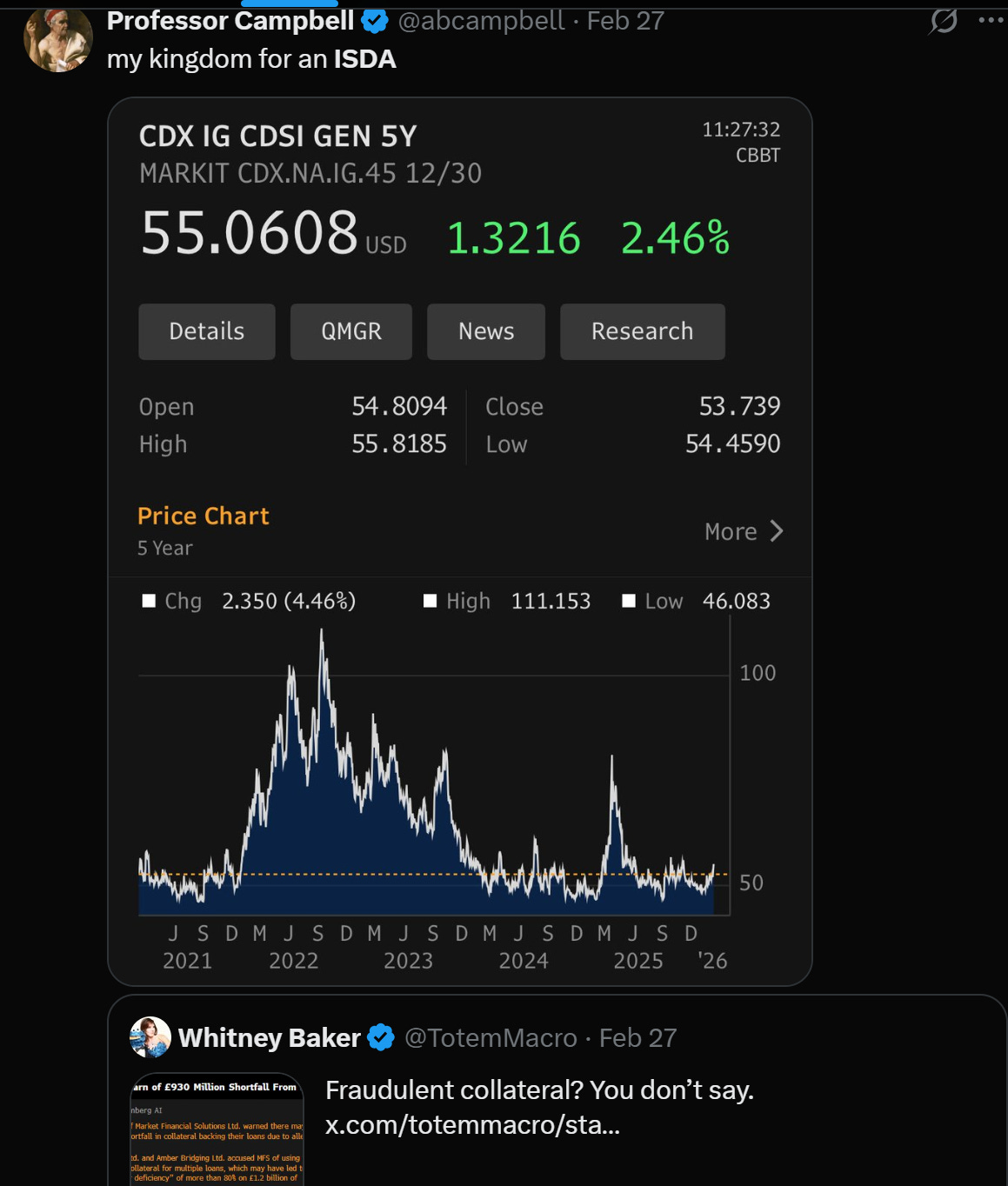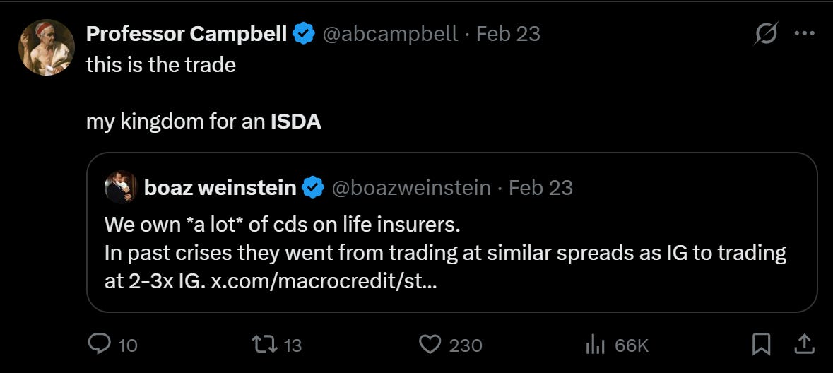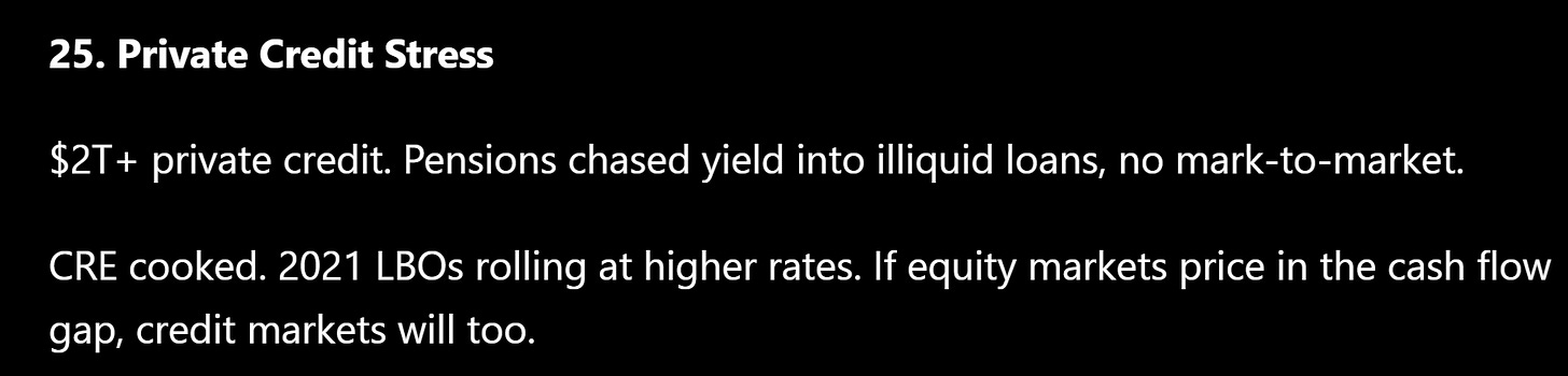 I should be upfront: I’m not a deep credit analyst. I haven’t done the single-name work to tell you which pipe is going to blow first, or which specific portfolio will be the next Cliffwater. This is a directional macro view, not a bottoms-up teardown. I’m going broad because that’s where my conviction lies, and because the right way to express this trade at scale is through CDS, not HYG puts. Single-name credit default swaps, if you can get the ISDA, are much better instruments for this. (My kingdom for an ISDA.)