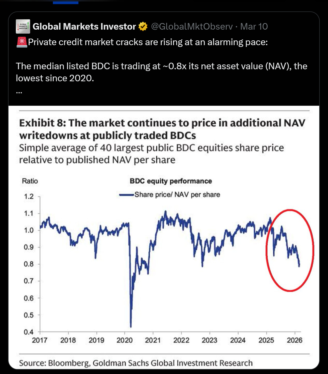 Leveraged Loan Prices Are Rolling Over. The Bloomberg US Leveraged Loan Index has fallen about 6% from its highs, with the tech-heavy sub-index dropping even faster. BDCs are trading at ~0.8x NAV, the lowest level since 2020.