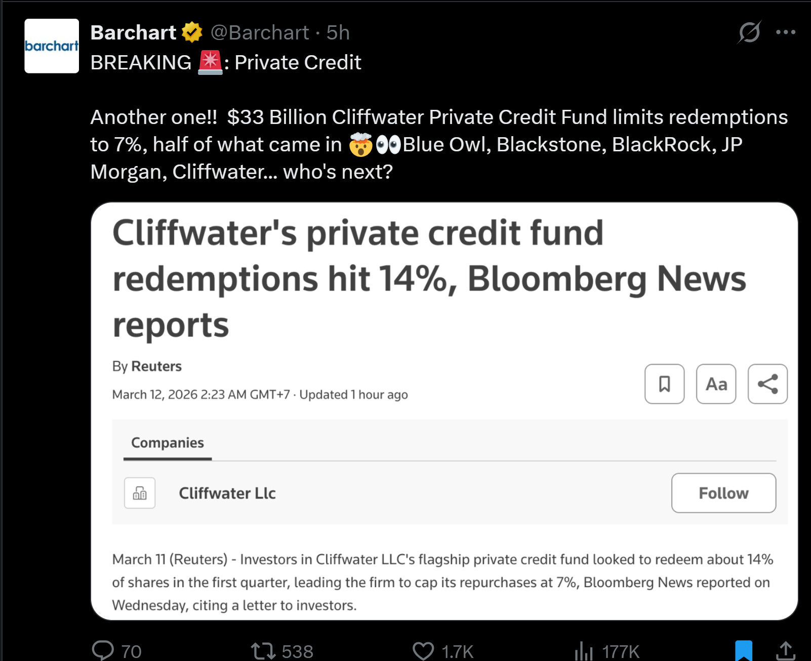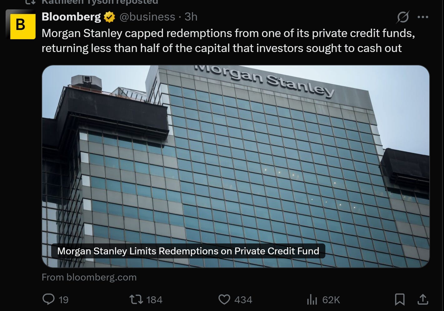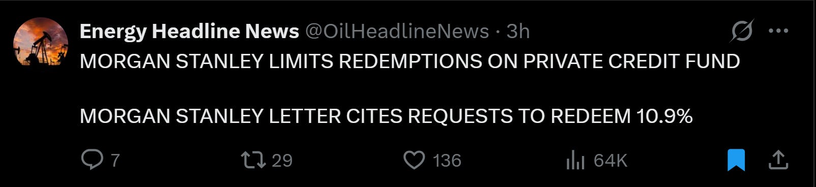Redemption Gating is Spreading. Morgan Stanley limited redemptions on its private credit fund after investors requested to withdraw 10.9% of capital. Cliffwater’s $33B flagship saw 14% redemption requests, forcing the firm to cap repurchases at 7%. Blue Owl, Blackstone, BlackRock, JP Morgan, Cliffwater. The list keeps growing.