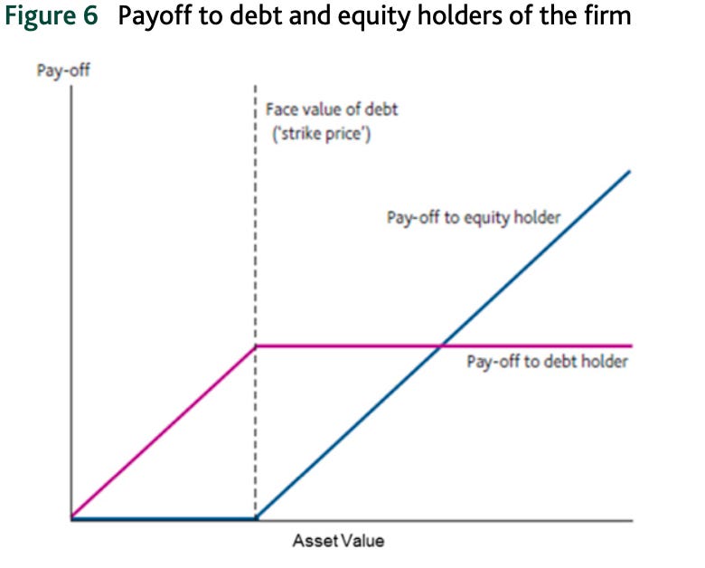 Under Merton, equity is a call option on the firm’s assets. Credit is the mirror image. Both instruments are looking at the same balance sheet from different seats. When asset values are high relative to debt, equity is deep in the money and credit spreads are tight. Everything looks fine. But when the debt-to-asset ratio starts biting, both unwind simultaneously. Equity collapses and credit spreads blow out. They aren’t independent risks, and anyone telling you they’ve “diversified” by allocating across both equity and credit in the same leveraged borrower has misunderstood what diversification means.