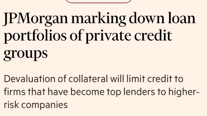 Banks Are Pulling Back. JPMorgan is marking down loan portfolios of private credit groups, which directly restricts how much these funds can borrow. When a bank tells a fund “your collateral is worth less than you thought,” that’s the first domino.