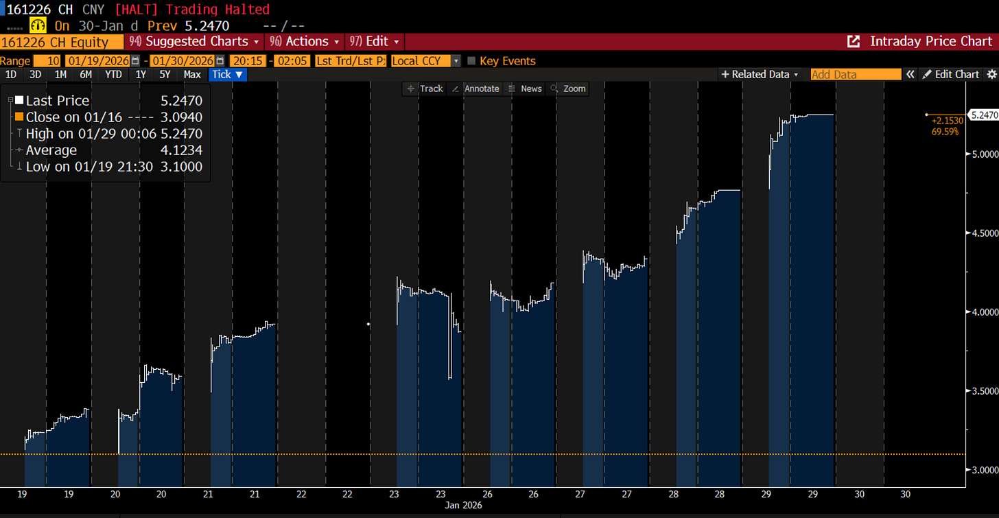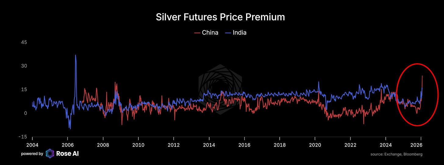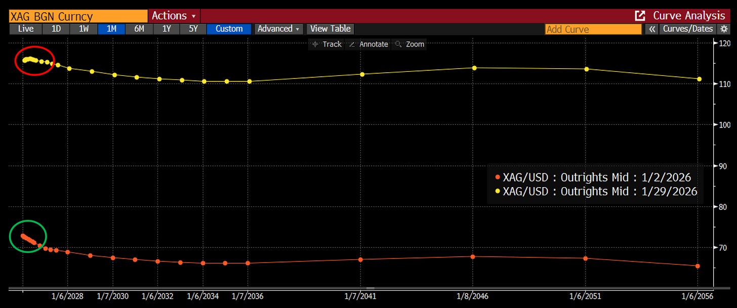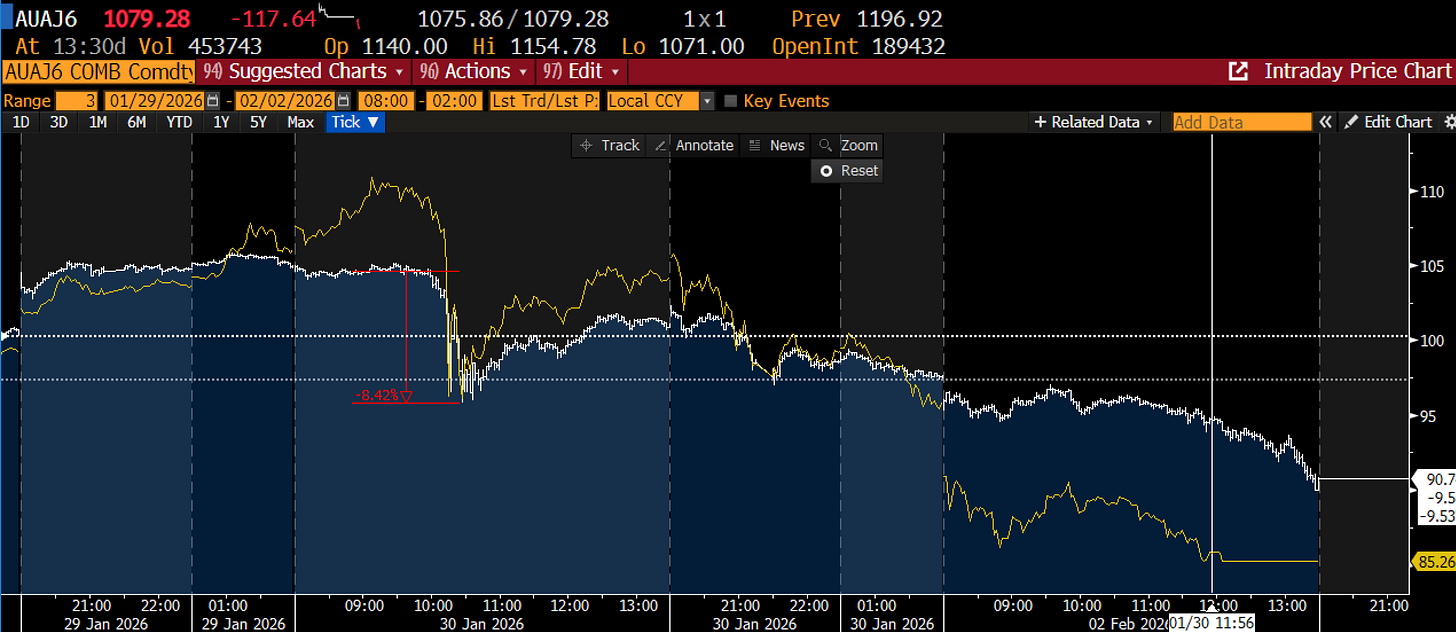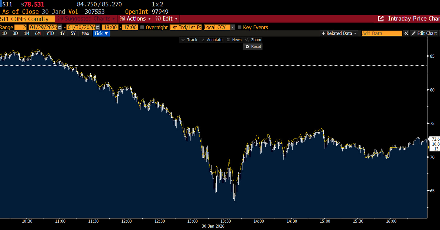 If you were tracking the story from a narrative perspective, even before Friday, the last couple of months has been a wild ride. Silver opened November in the high $40s, and rallied 74% through the end of the year to ~$85, before selling off 15% going into the end of the year. As outlined in our last piece, bulls then defended the trend, kicking off another monster 65% rally through Monday peaking around $117 (in New York mind you), when western sellers came in selling, pushing us down 15% again.