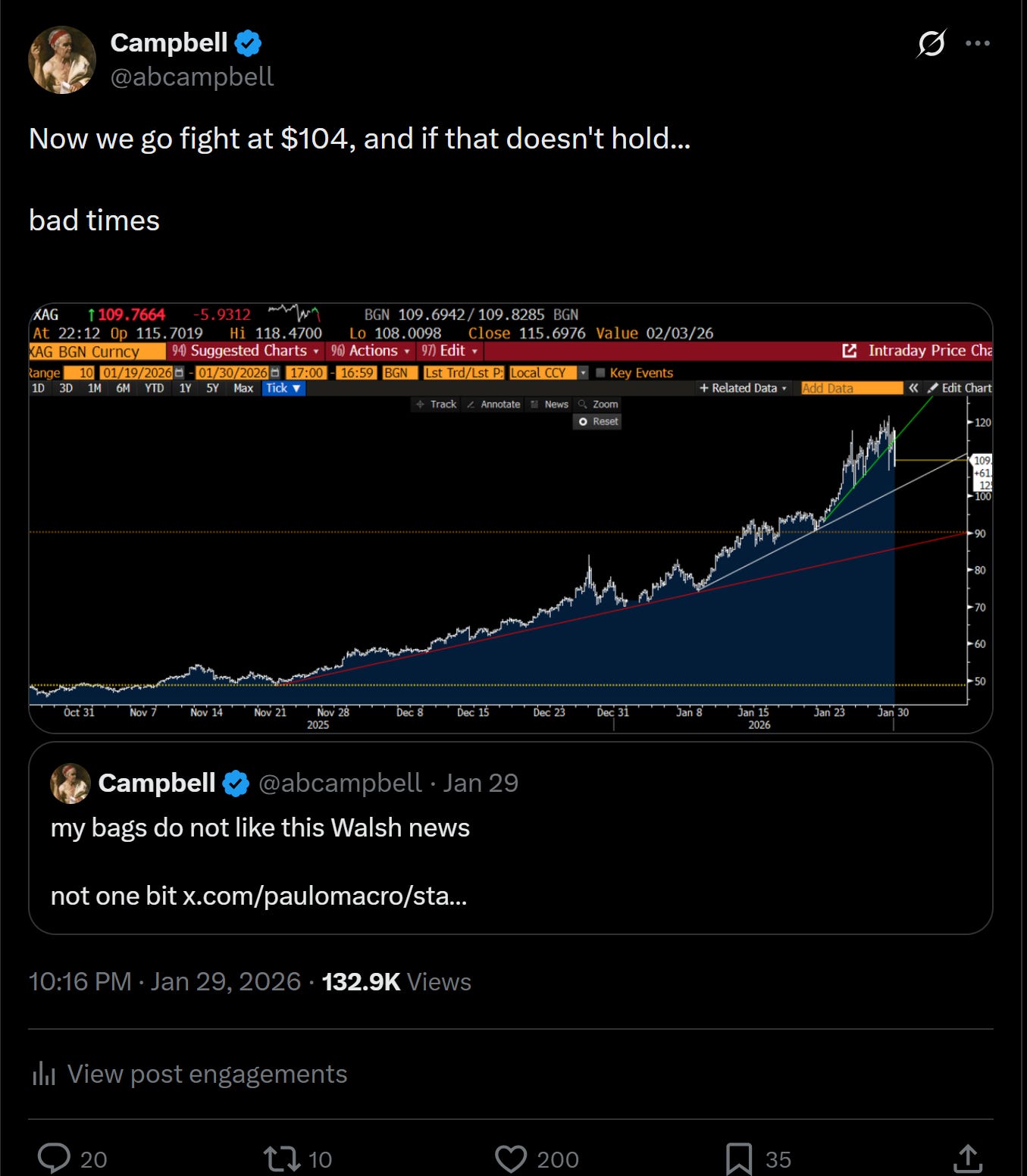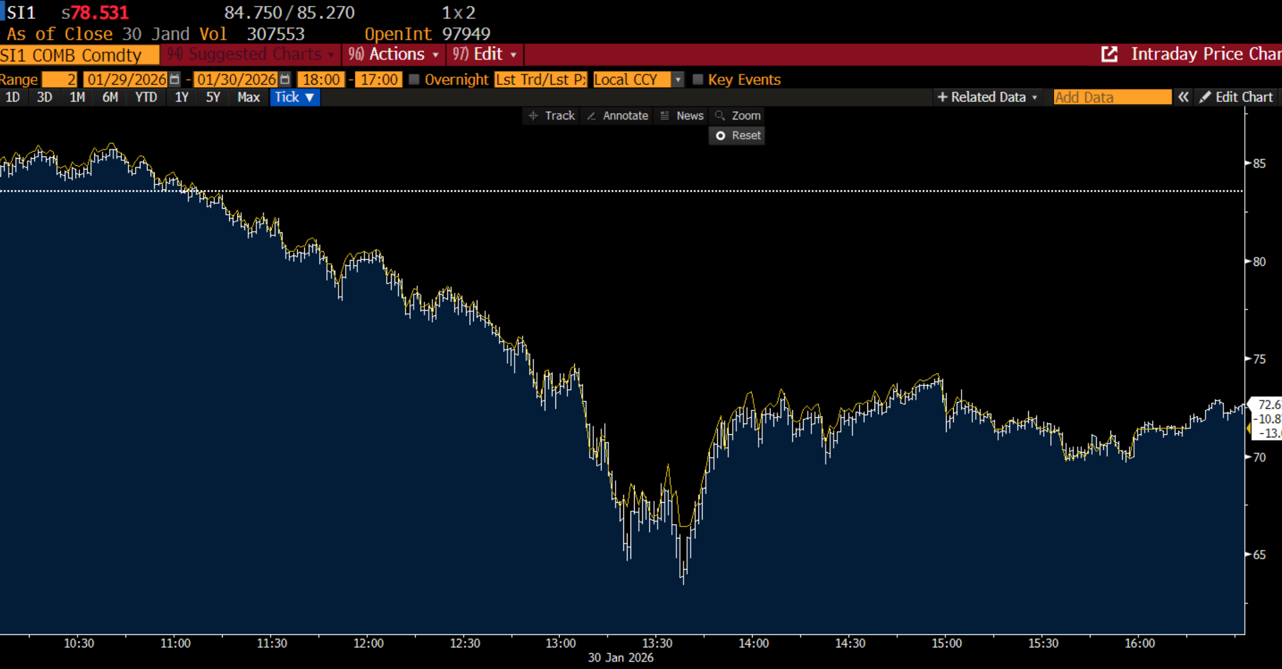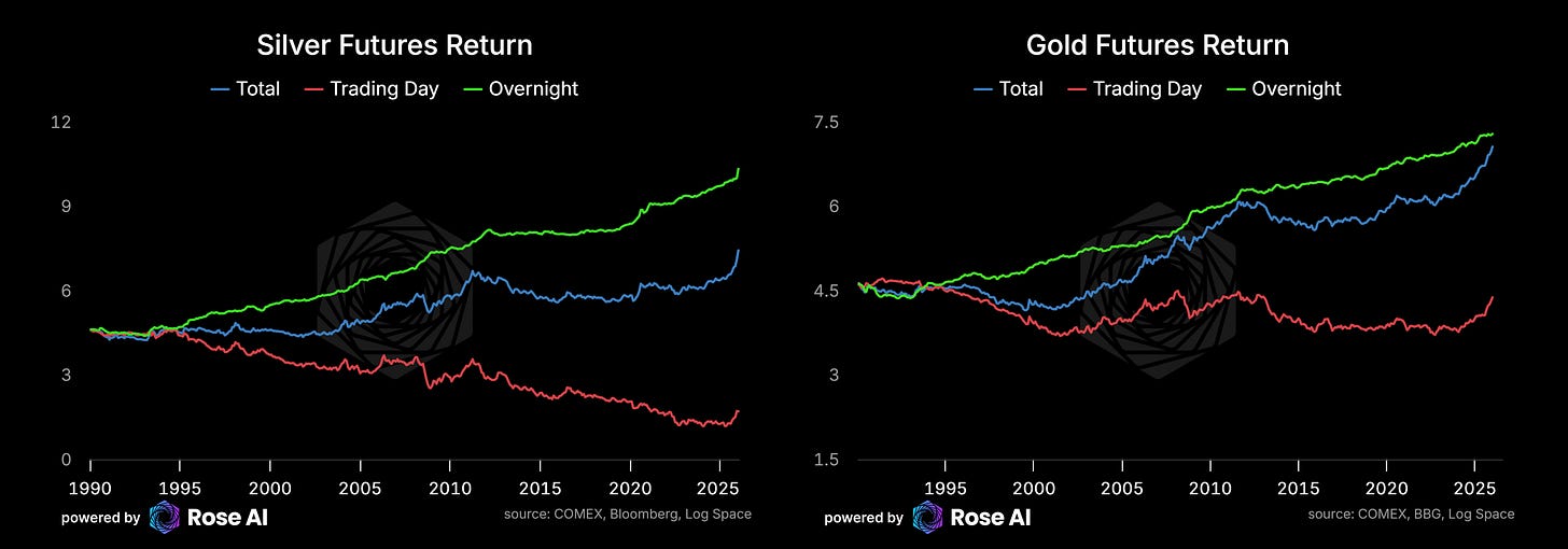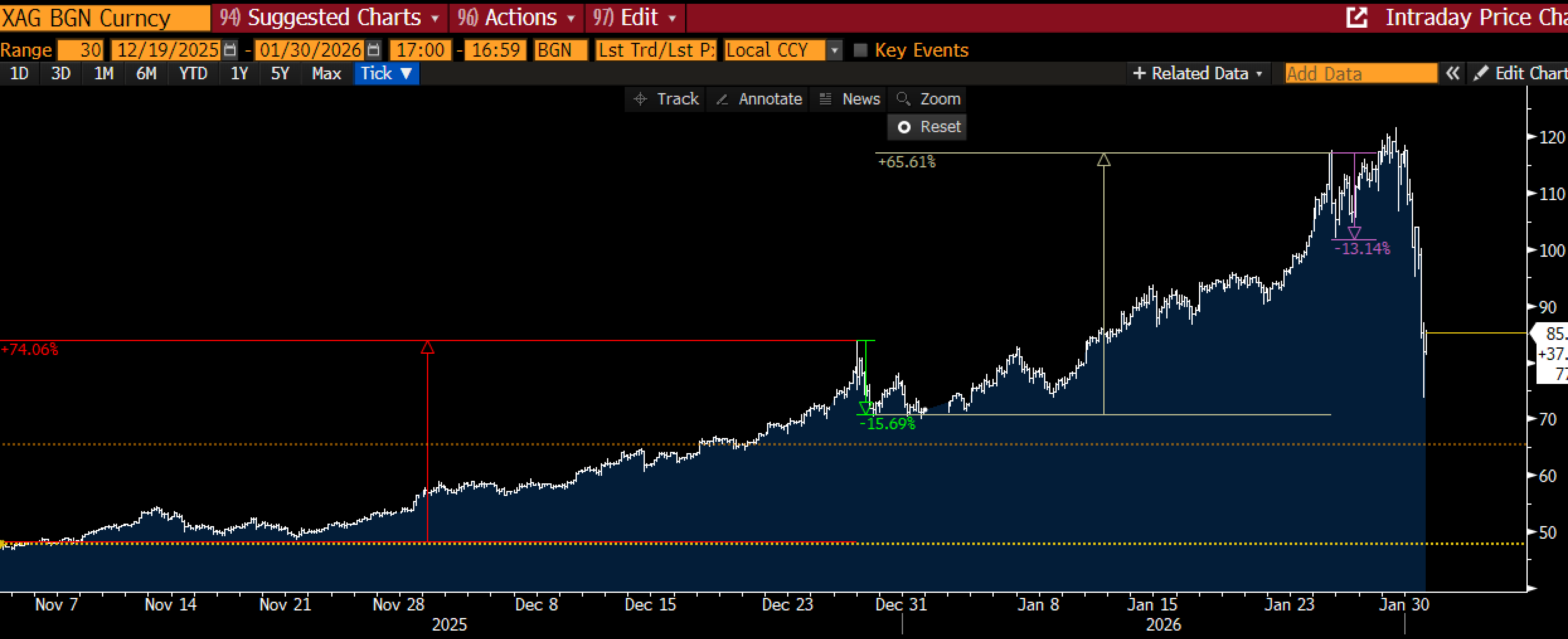 If you were tracking the story from a narrative perspective, even before Friday, the last couple of months has been a wild ride. Silver opened November in the high $40s, and rallied 74% through the end of the year to ~$85, before selling off 15% going into the end of the year. As outlined in our last piece, bulls then defended the trend, kicking off another monster 65% rally through Monday peaking around $117 (in New York mind you), when western sellers came in selling, pushing us down 15% again.