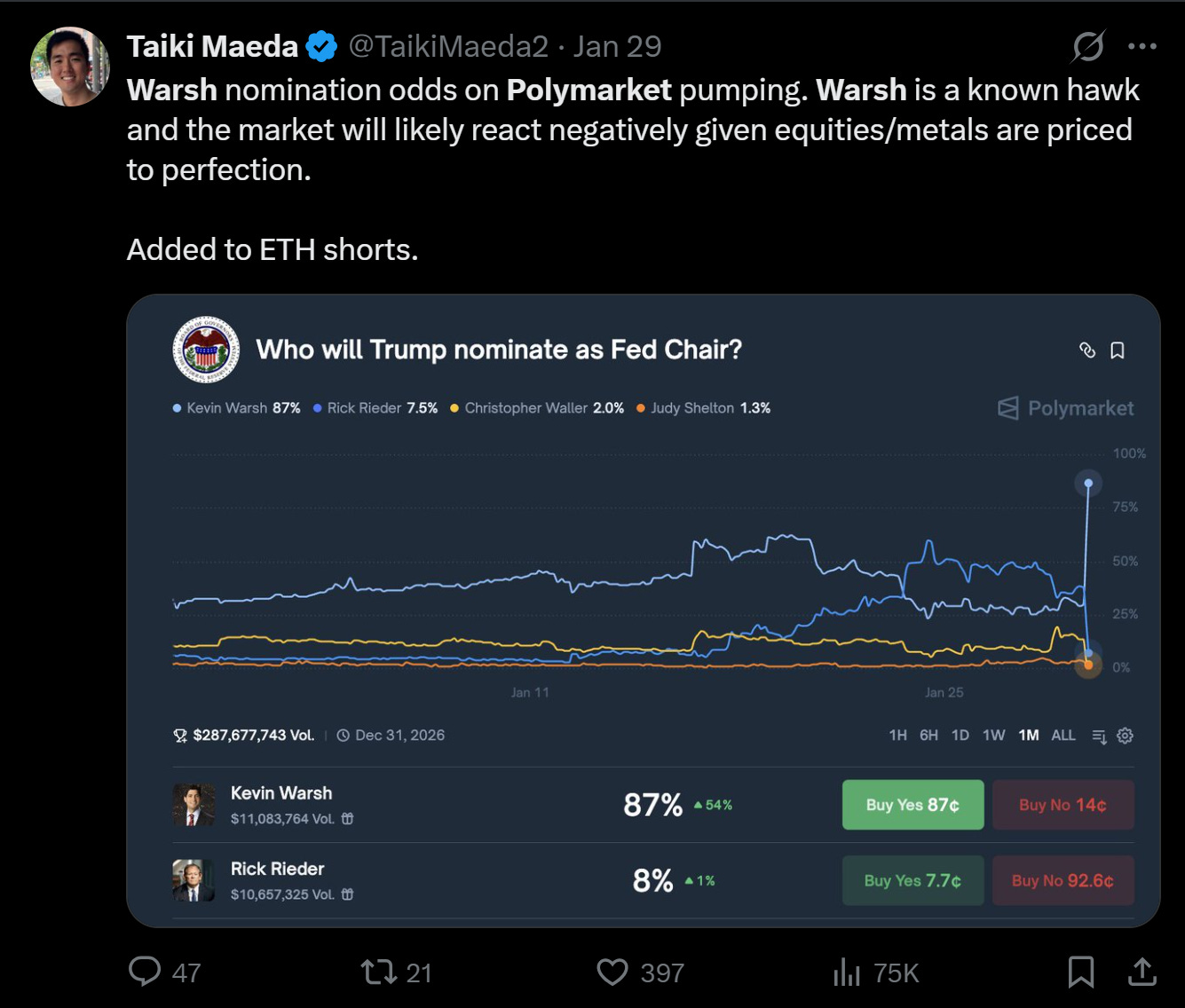 Enter Kevin Warsh late Thursday, whose nomination to Fed Chair late Thursday was confirmed/leaked by Polymarket.