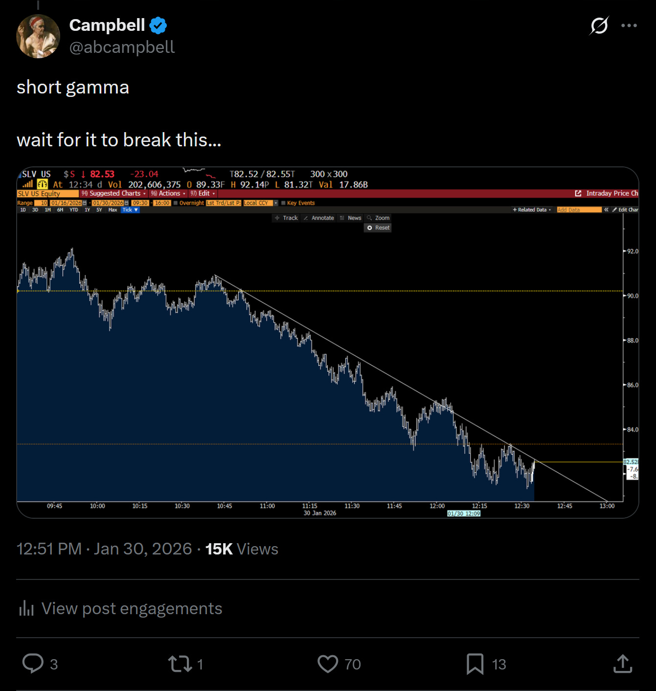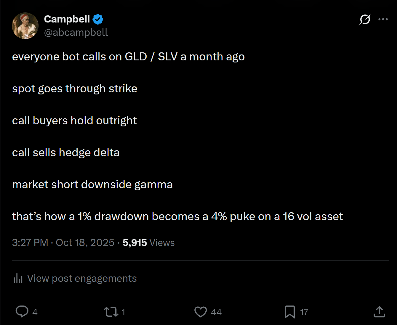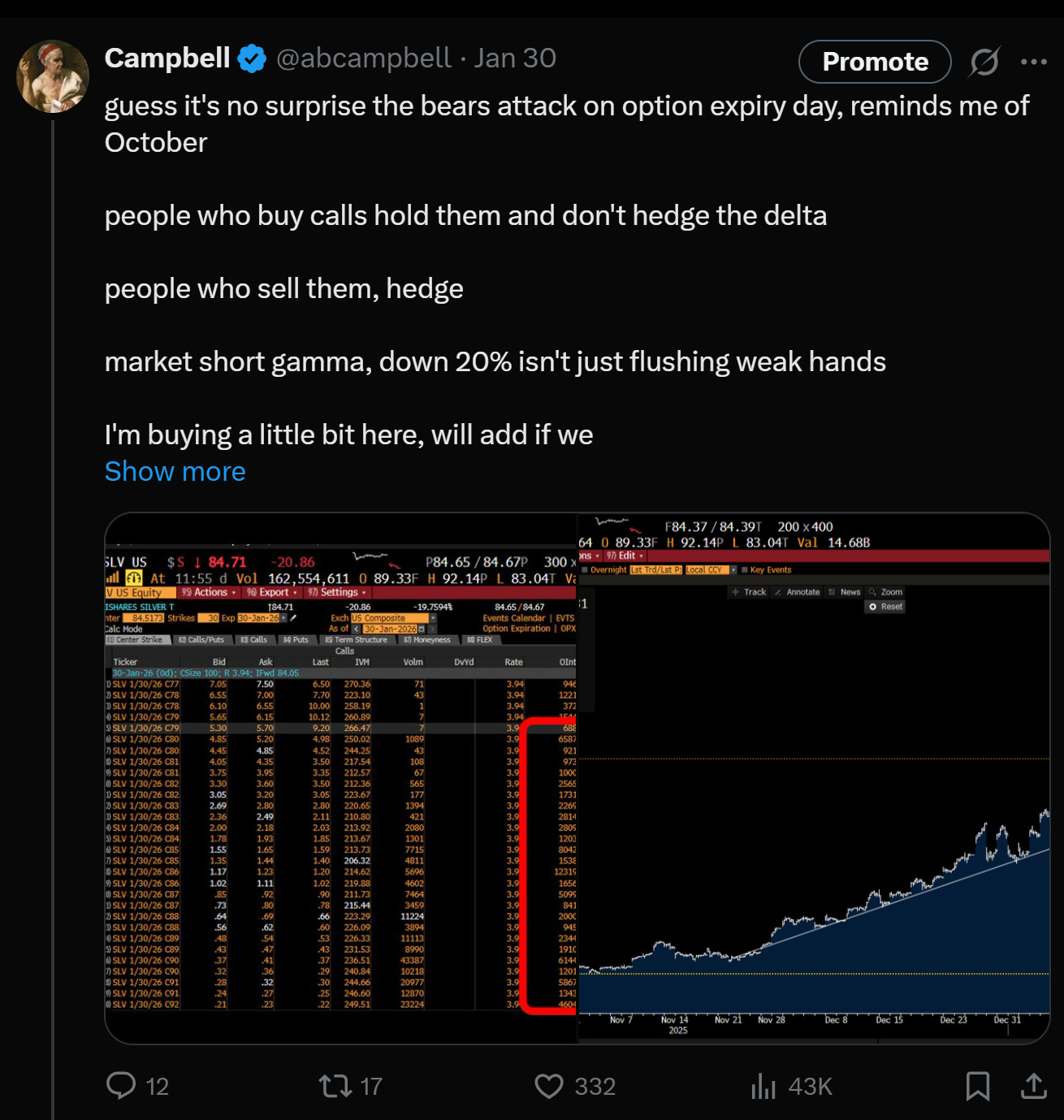 A shot across the bow to probably get out. I checked my book, did a back of the envelope across the positions, feeling content that most of my long exposure was in the form of options, so if we did entirely wash out, I would take more pain, but not entirely wash out. This was strike two. Not just because I should have hit the bid on futures (GLD and SLV were closed, and I had developed a distaste for futures given a couple of scarring experiences forgetting to roll positions while not trading full time over the past couple of years), but I probably should have just pledged to cut as soon as the market opened up. Yes, I had an entirely full plate of meetings, which would make it impractical to close a portfolio of 20 options positions, but I didn't really want to flee like a dog in the night, whilst so many of the folks out there were still long. This was strike three and perhaps my worst decision.