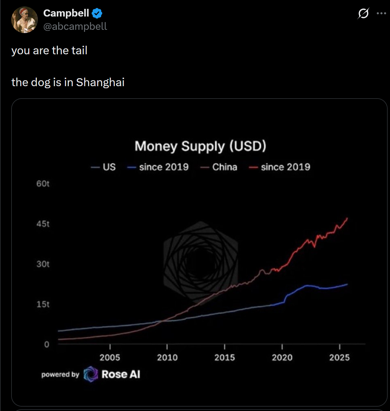 c) How much money actually exists in China compared to the west: