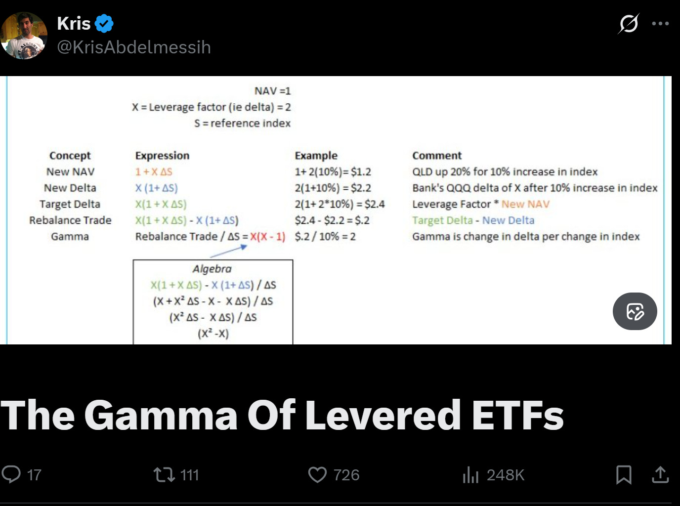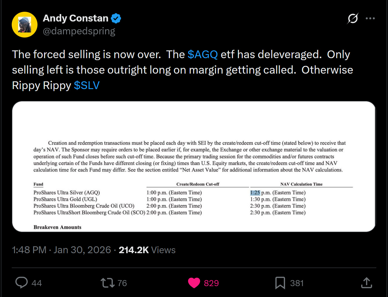 The third way this market was short vol was a bit of a surprise to me. Unbeknownst to me, the 'double levered' silver fund AGQ had accumulated $5b of assets, promising investors 2x silver returns. Meaning for $5bn of assets, they held $10bn of silver (in this case via futures). This fund 'rebalances' every day, and so when folks woke up to silver down 15%, in essence the fund was down 20% * $10bn or $2bn. Bringing the fund value to $3bn before redemptions. Meaning their new 'delta' was $6bn and they had to sell $4bn of silver!