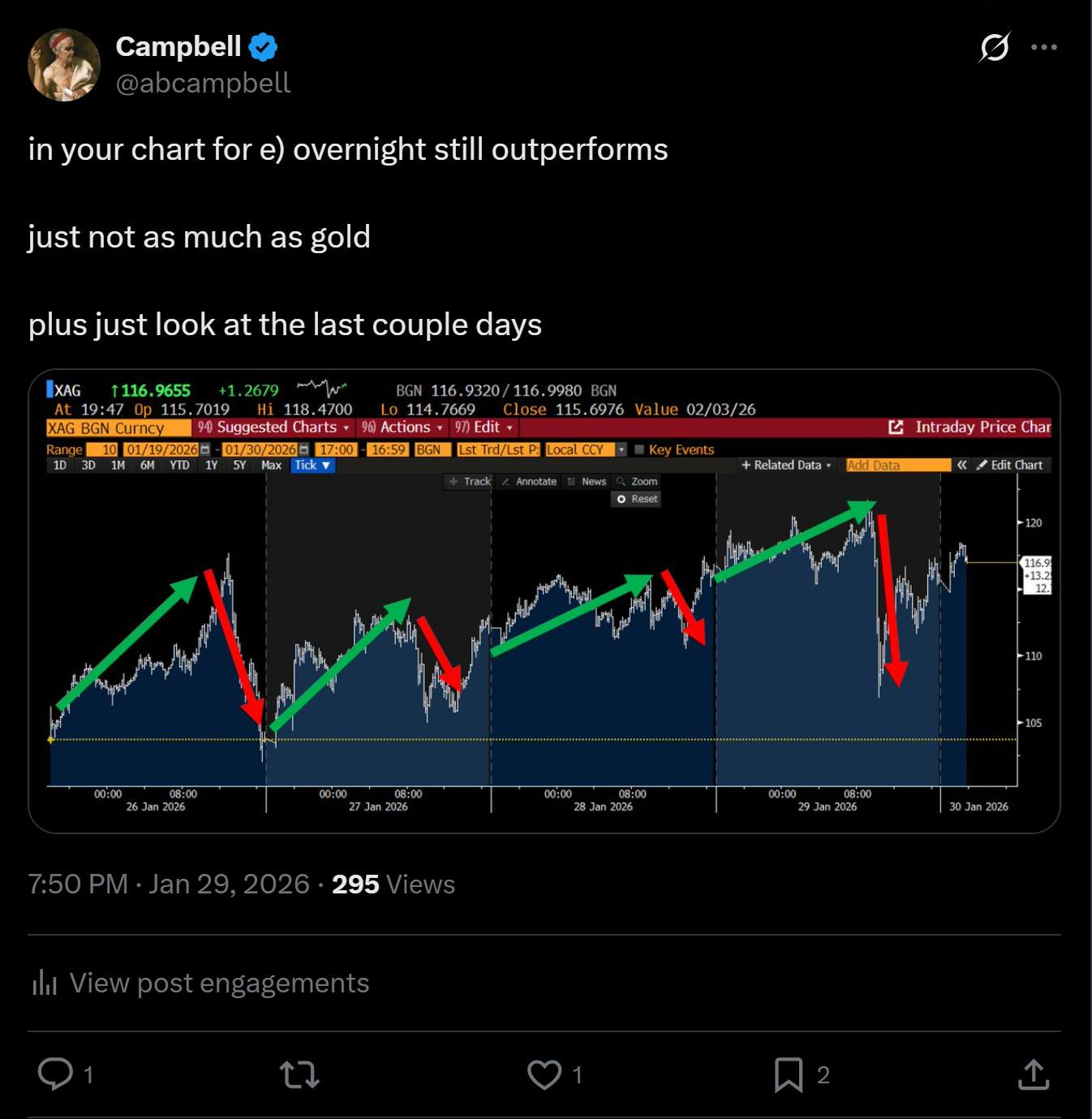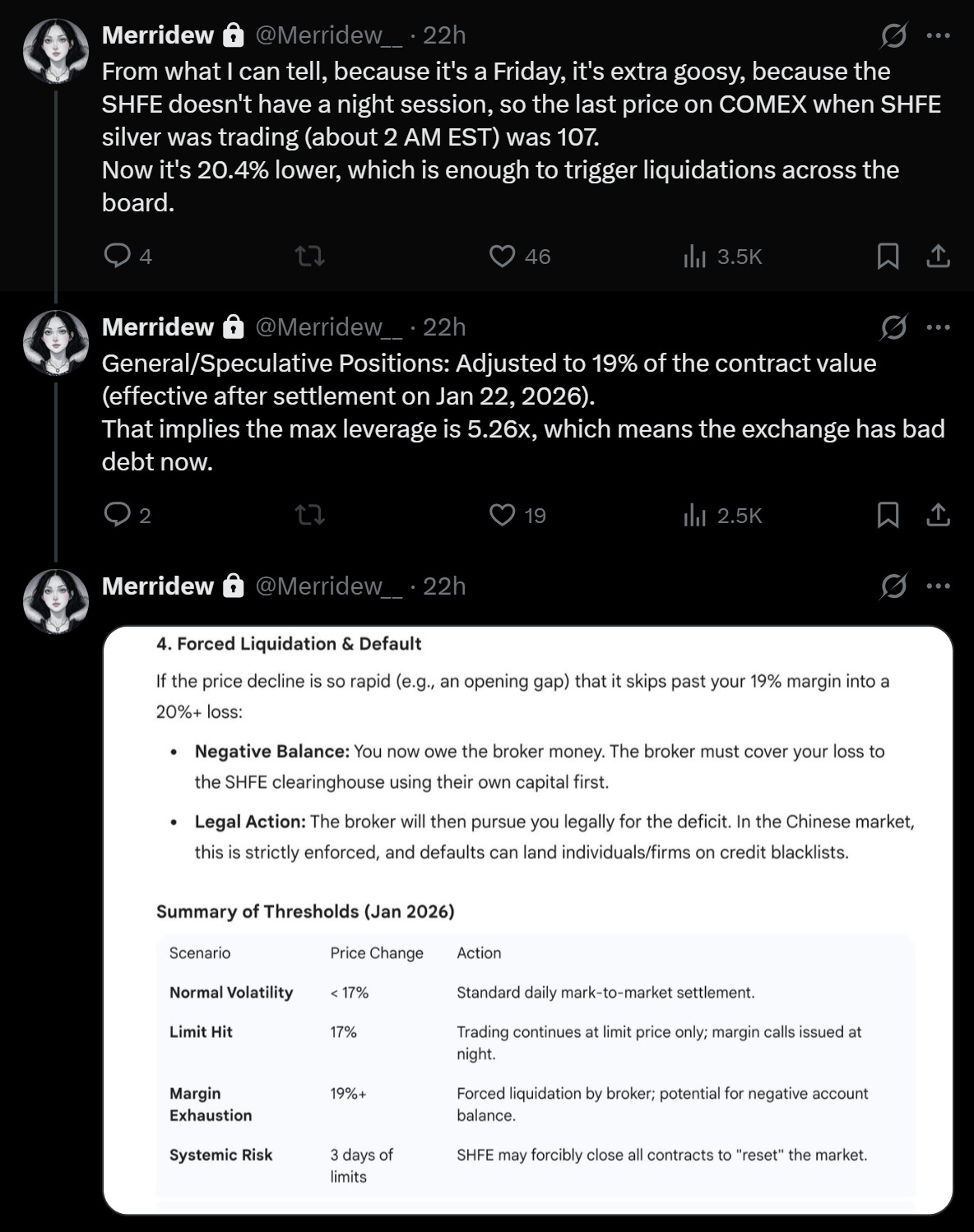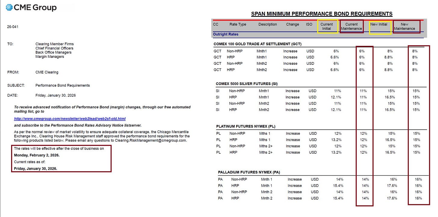 Add in the fact that CME raised margins (again!) Friday, though keep in mind with prices ~30% lower, even higher margins mean the net cash draw on longs is likely de minimis. So much more per unit of silver, but around the same amount of futures margin.