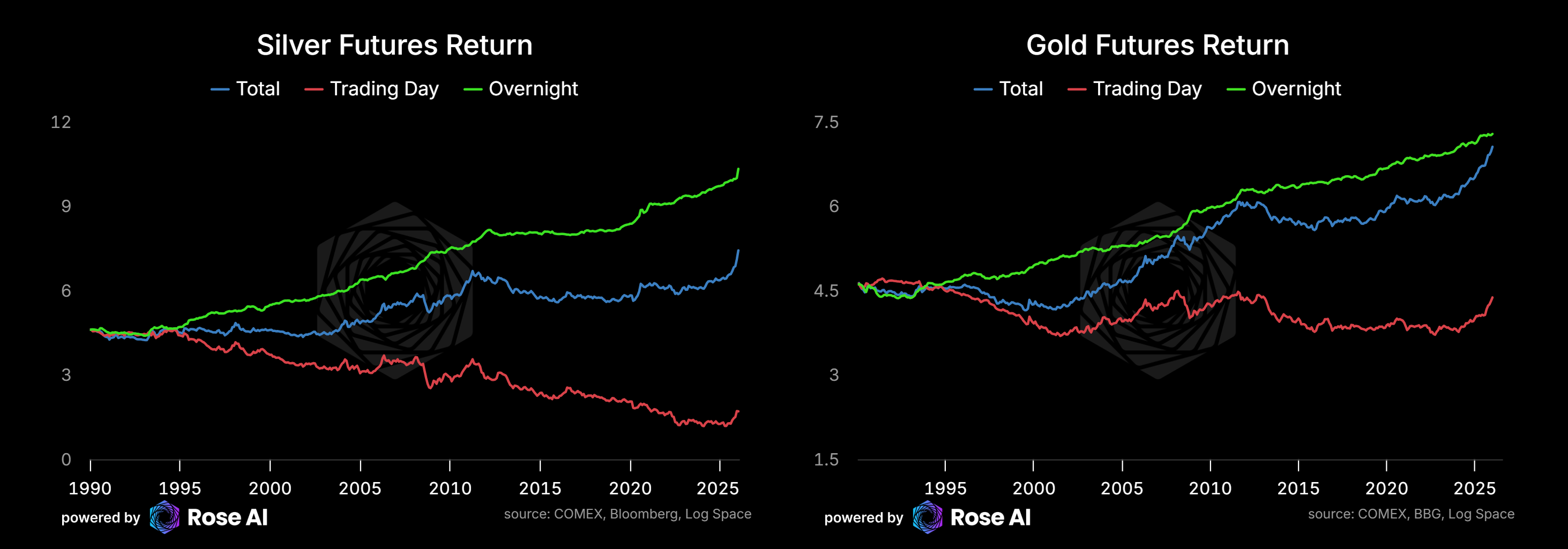 b) How much the overall return for these metals has been derived from the 'overnight' market (measured by the return from yesterday's close to today's open)
