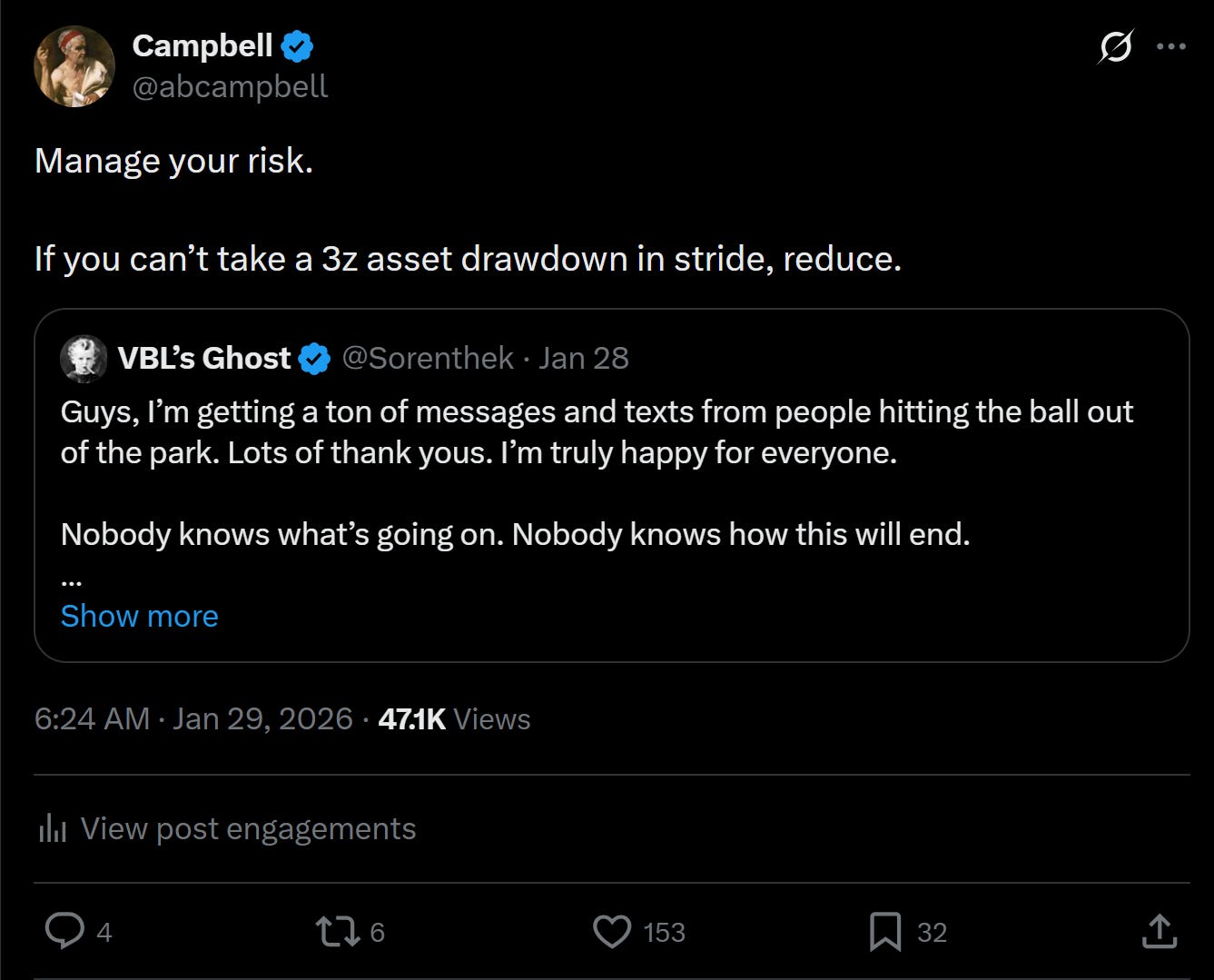See, many of the folks reading this blog now are relatively new. Eyeballs chase returns, and the price move from $60 to $120 brought a lot to these pages, and my inbox. People thanking me. People asking me for hot takes. A seemingly infinite line of folks in my replies asking me for minute by minute updates or 'levels' or what have you. A process probably well known to much more well known public voices, but, at least to me, relatively new.