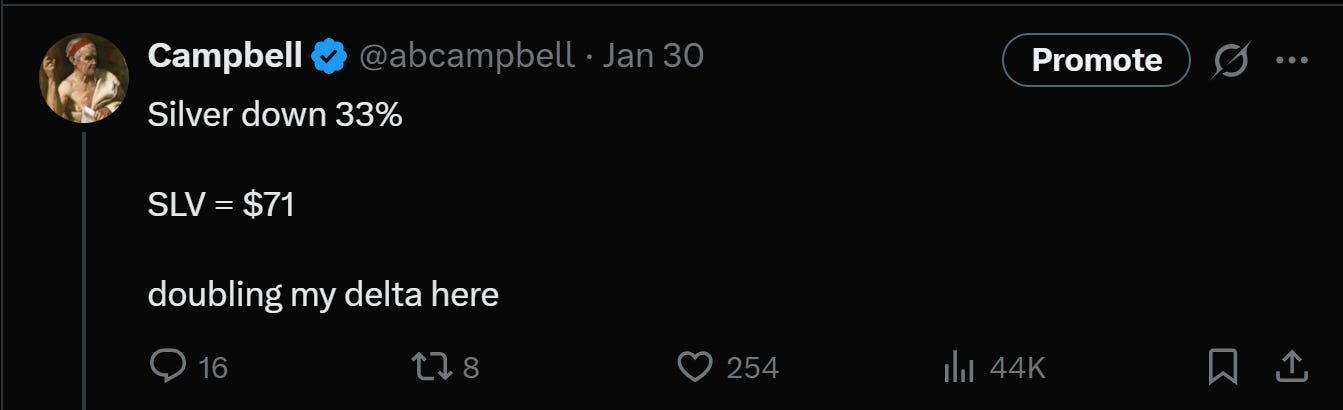 I first started writing about the silver/solar nexus back in 2023. I started 'pounding the table' around 18 months ago. When my portfolio was 100% long. As the price rose, from $25 to $40, then $60 and $80. I slowly reduced that exposure from 'irresponsibly long' to 'dangerously long' to 'still pretty long.' Selling off little bits or letting options roll, trying to bank profits while maintaining exposure. Thing was, as silver climbed this wall, it also got more volatile. So I still did pretty well. This is where naysayers say this was a red flag, which of course it was, which we will deal with later in the section on 'tells' but the important point is that you end up in this weird position where even though there were many folk along for the ride at $25 or $40, you realize that the eyeball-weighted perspective, just between the lag from when you write and when folks actually ingest that information, could have been as high as $90.