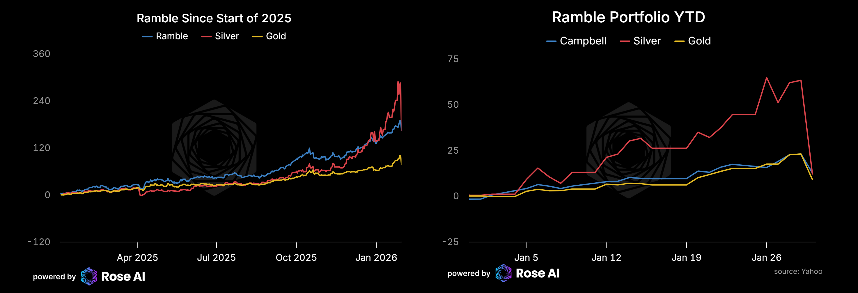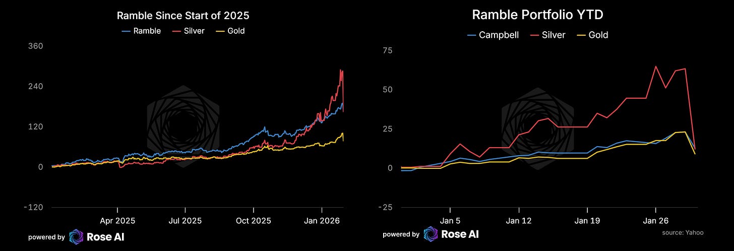 There was actually a fourth way I was short vol which is even more wonky. Owing to my proclivity to buy call spreads and flys, where I would buy at the money vol and sell upside, I had been 'rolling' my options as we got progressively higher and higher strikes. Partially to maintain my position and partially to just hedge some short exposure from the curve trade I had talked about previously. This left me with a false sense of security since I was long at the money vol but also meant my delta increased as prices fell, whereas my curve trade actually reduced its exposure as we went down. Meaning my dirty hedge gave me another source of short vol. For all my talk of being long vol and flat delta (going into the close last night), I was actually short a fair bit of gamma. By the end of the day I had lost 2% in silver and 2% in gold. Adding up losses in copper and other positions, we ended the day down 8%, bruised but not beaten. Bringing our YTD to up 12.6% and cumulative return since Jan '25 to 165%.