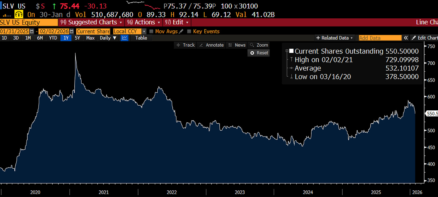 Well, first, shares of SLV were already going down before the sell off Friday. Along with the reduction in price, it means notional exposure is down a bunch.