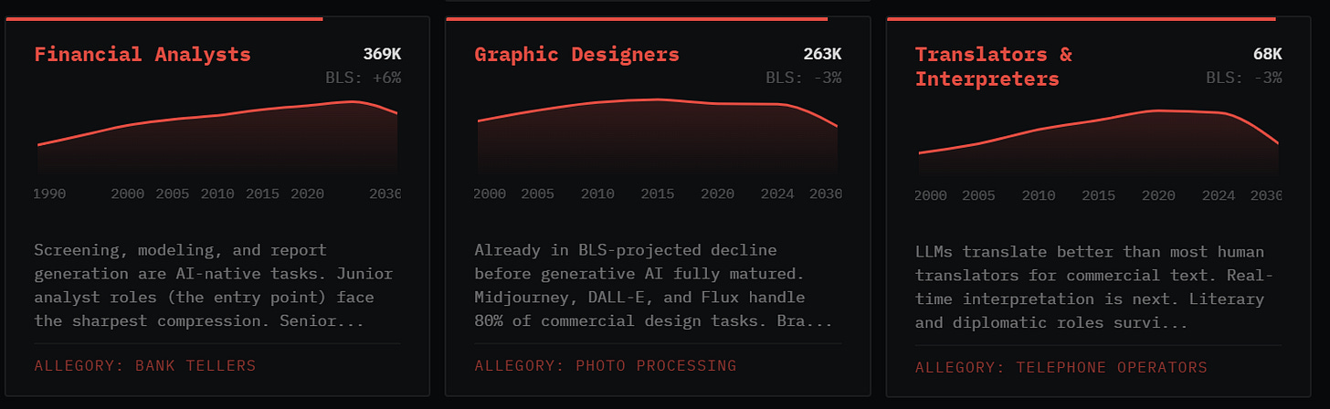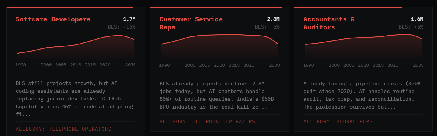 Customer Service (2.8M) — BLS already projects -5%, so even the slow model sees it. Klarna replaced 700 agents with AI, cut resolution time 80%. India’s $50B BPO industry is where the real bodies are buried. Allegory: telephone operators.