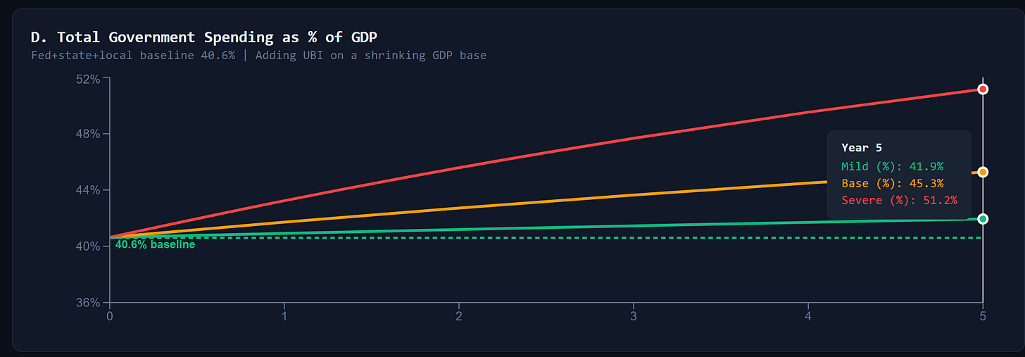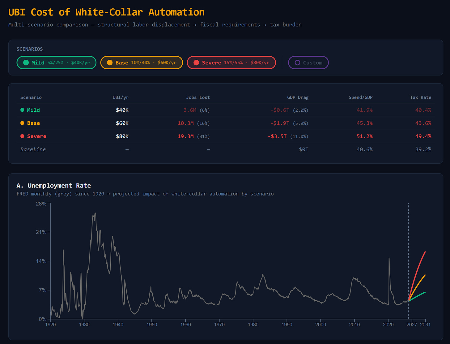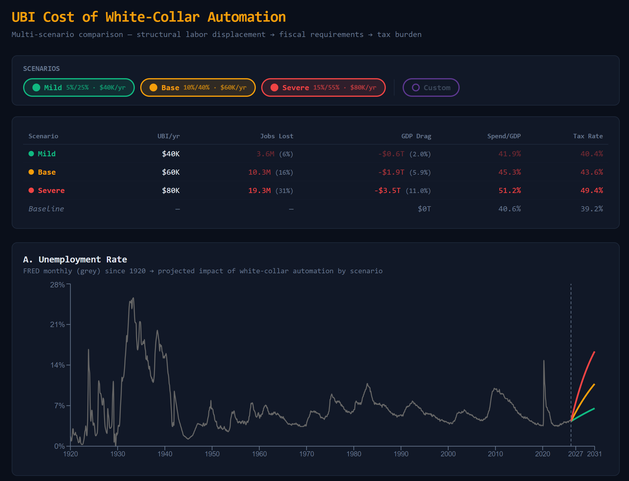 To help size the anxiety, we modeled three scenarios for this piece across different rates of automation and UBI generosity. Even in the mild case, unemployment rises to 6% and the GDP drag runs half a trillion. In the severe case: 16% unemployment, $2.8 trillion drag, effective tax rates approaching 50%.
